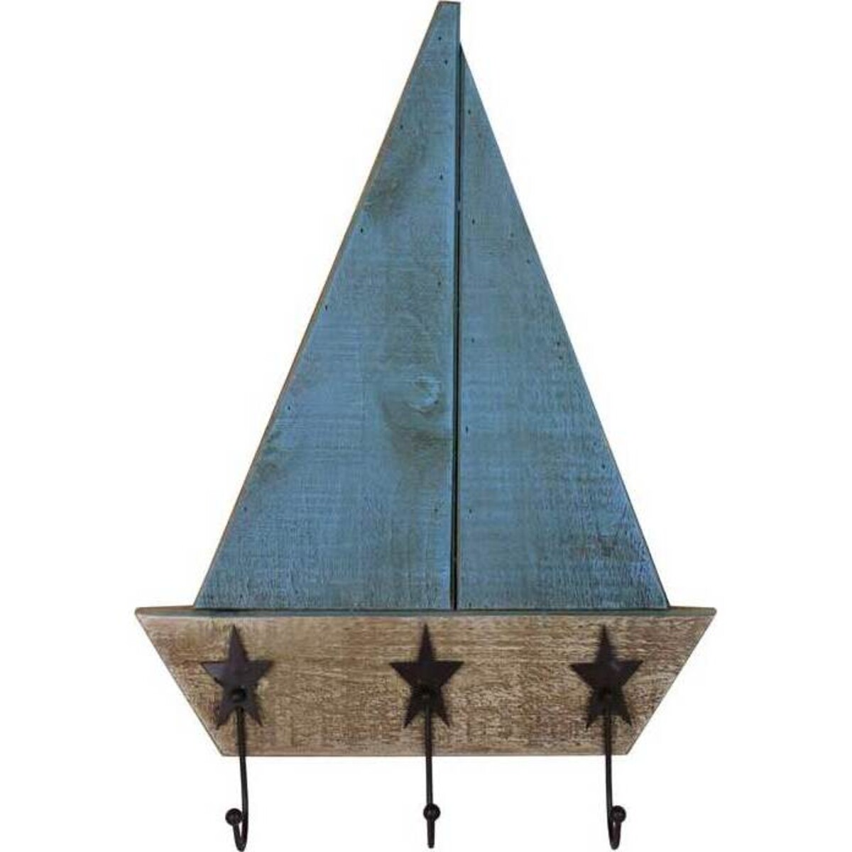 Hooks Sailboat Star measures 50x35x8 cm and is made with wood and metal. It comprises of a wooden sailboat structure, with the sails being painted in blue and boat retaining natural texture. Three black hooks have been fixed on the boat at equal intervals. This product has been crafted with style to suit a background where lots of natural wood furnishing is used. Homeowners may have Hooks Sailboat Star fixed onto walls within the bedroom, just outside the door or even kitchen area. It can also prove helpful within office settings, libraries and other facilities where people can utilize it for hanging coats, hats, bags and other personal effects.