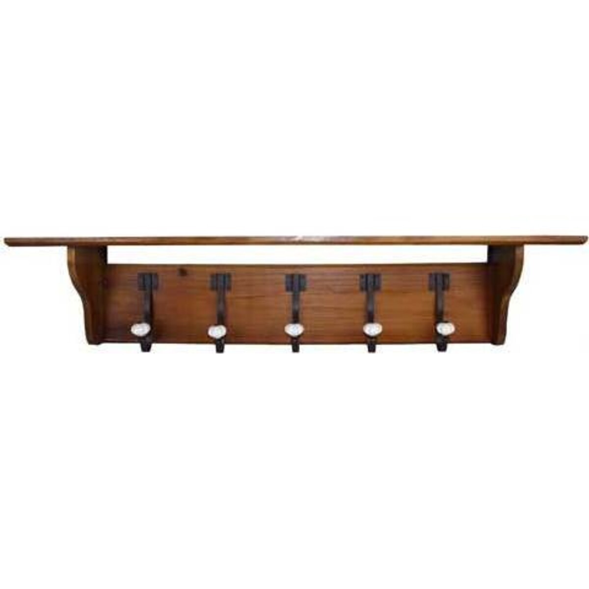 Hooks Shelf Natural features five hooks in total, fixed underneath a shelf, with the entire setting featuring well - polished wood of natural brown texture. The hooks are made using metal, with ceramic being employed at the tips. This makes them appear stylish and suitable for official as well as domestic usage. Homeowners may incorporate Hooks Shelf Natural into the architectural style of their homes when constructing them to ensure creating remarkable contrast in interior design. This item measures 99x24x32 cm and comes in handy for hanging an array of items among them towels and coats of different kinds.