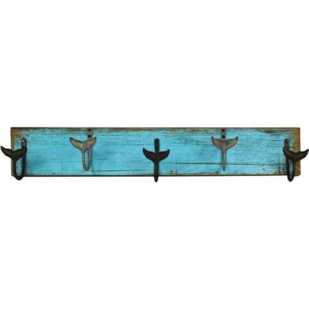 Hooks are an important article of utility at home and when they come with a design that draws attention right away, they do add a great deal to the decor. This set of hooks comes with amazing hook pattern - the tail of a whale! The tail naturally curved makes for a fine hook. The blue backing for the hooks is made of wood, in a distressed style - aging and truly vintage while the hooks are fabricated from metal. They are gray and black in colour making them look quite attractive. The shape has been beautifully replicated and the hooks pan out to 60 cm across thus giving adequate space for coats, bags and even umbrellas to be hung on it. A nautical them home would of course love to have this as an add on but its features are so uniquely attractive that anyone would like to have this sweet of hooks for their home.