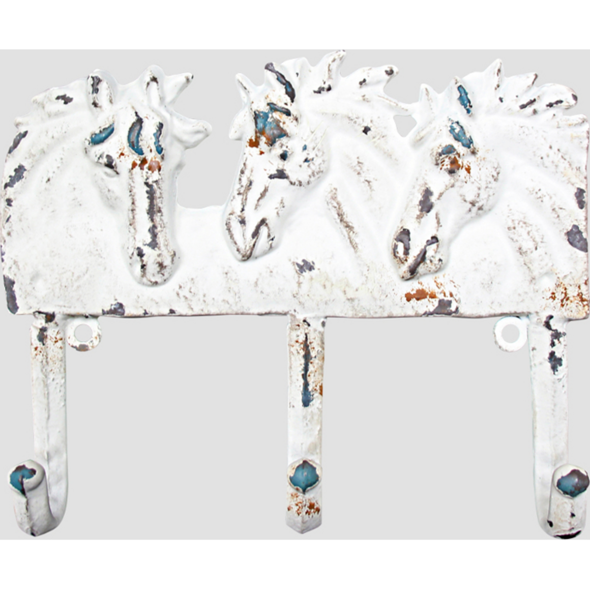 This hook bracket has been forged and fabricated with metal ensuring that a certain ageing effect through distress treatment is created. The 16 cm in height frame ca be placed on the wall with two nails for which slots have been created in the frame itself. The white coloured frame showcases three horses close together-the wonderful detailing is highlighted all the more because of the rustic ageing and the peeling paint in several places throwing into relief the subtle hints of age. The hook bracket has three round topped hooks that will do splendidly as coat hanging hook as they would in the kitchen to hold your apron or napkins-the size is compatible with all kinds of uses. Lend the entryway of your home this cottage and country charm hook bracket and introduce the them in the best possible and yet simple way.