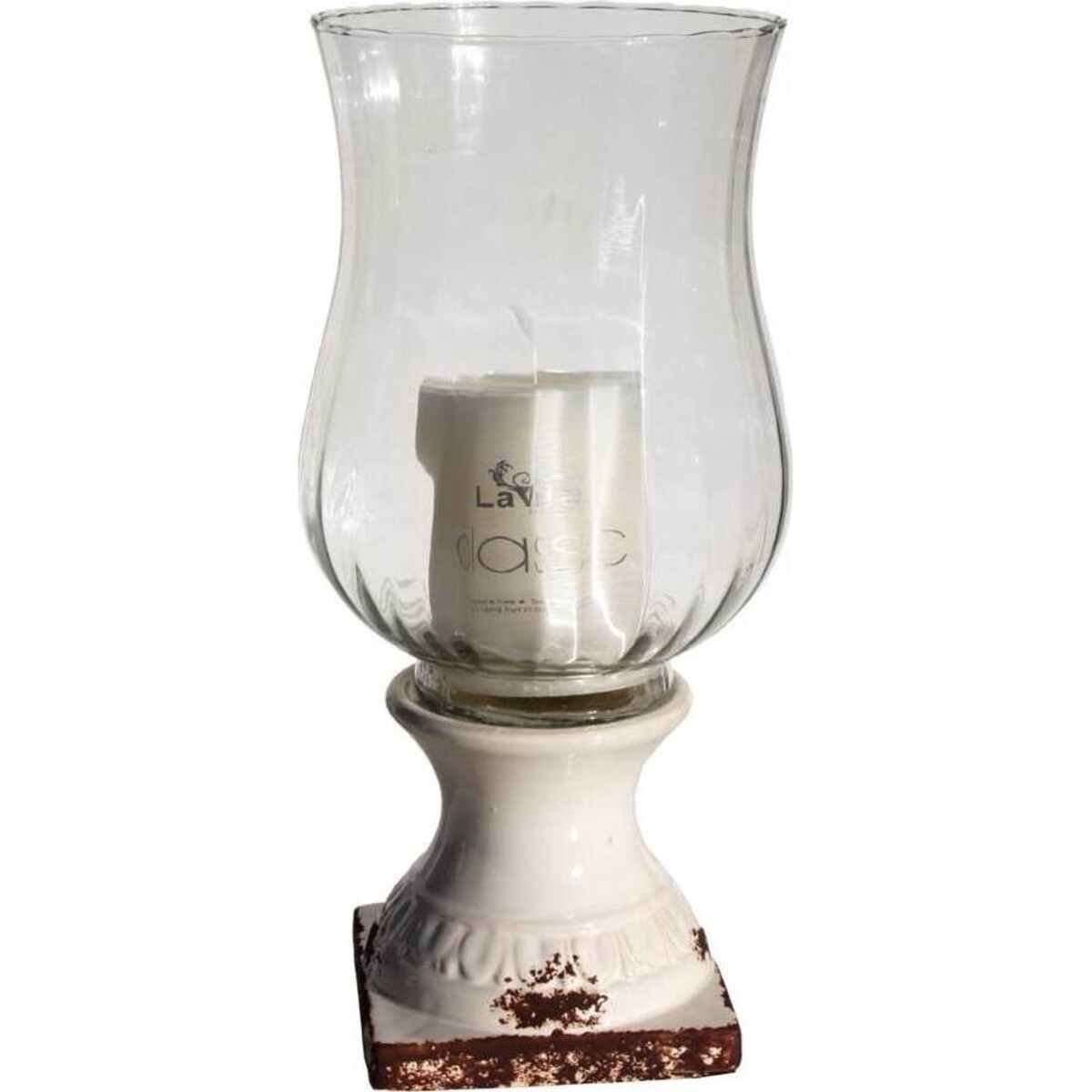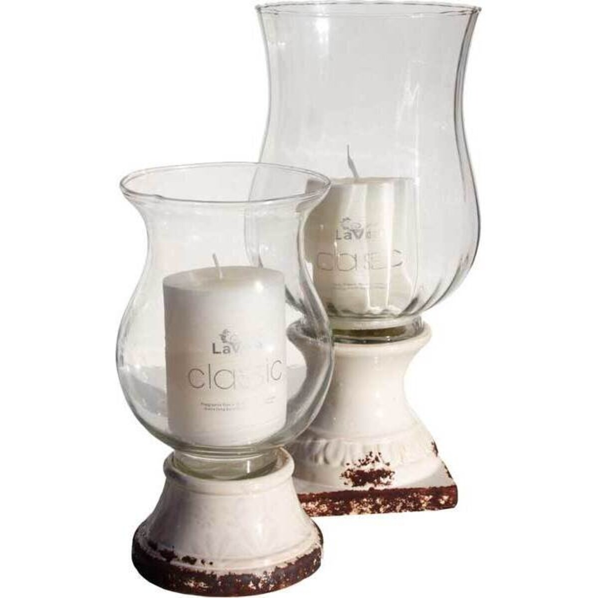 This white hurricane features a carved leaf design as well as dark brown worn detailing around the square base. At the top sits a curved glass in which you can put a small pillar candle, preferably one that is white. You'll adore the way this piece looks in your home and how the flame bounces off the clear glass. It's a great decorative accent to display individually, but even more so when you put it out as a pair, such as one on either end table. Everyone will want to know where you got them and how they can get their hands on them for their own.
