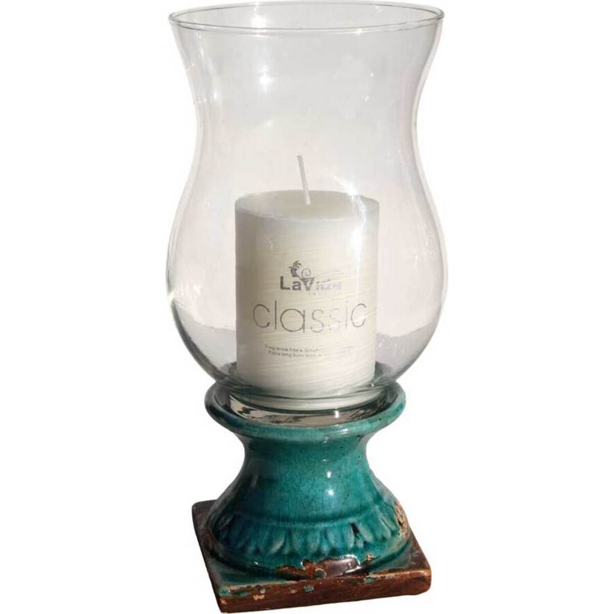 This fabulous hurricane is just as beautiful as it is functional. It consists of a turquoise base with a wraparound leaf design and a touch of dark brown to give it a worn and weathered look. On top is a clear and curved glass that can easily fit a tall pillar candle. While this item is relatively small, it packs a big punch of style that can change an entire area. This piece is lovely when displayed on its own, but it's even better when it's in pairs, such as displayed on two end tables. Expect to get a lot of compliments on this piece with many asking how they can get one of their own.