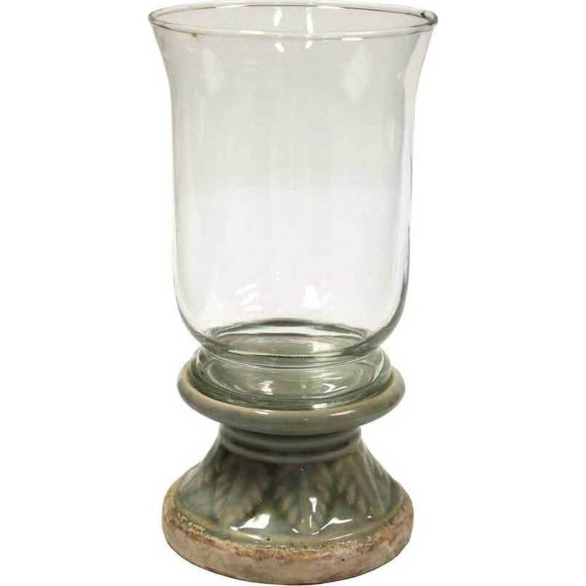 The clear glass candle holder securely sits on a ceramic stand with the misty leaf motif in light green shades. It has much wider base for stable and balance results.