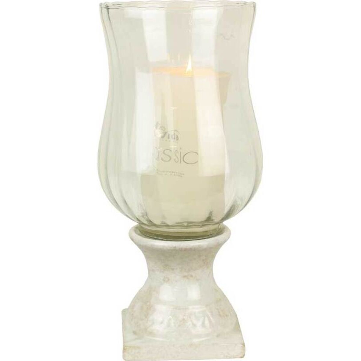 Be it the sit out you created on the roof, the patio or the good old dining table where you may has hosted innumerable evenings for folk and family - there is always need of s fresh breath of change in the look and a great way to build that in is by adding hurricane lamps like this ceramic and glass creation. The base looks like a conventional candle holder, while the grooved top allows the clear glass shield to rest with adequate support to protect the flame. The ceramic base comes in an off white colour with a fine design. The base is solid and well grounded for support while the shade itself has bevelled look, that adds so much symmetry and a look of class to the entire piece. About 34 cm in total height, it will be a great addition to the table or to a corner or any other spot that could do with some additional lighting. Making the table glow with something truly special is the cut and design of the chimney that is rather special.