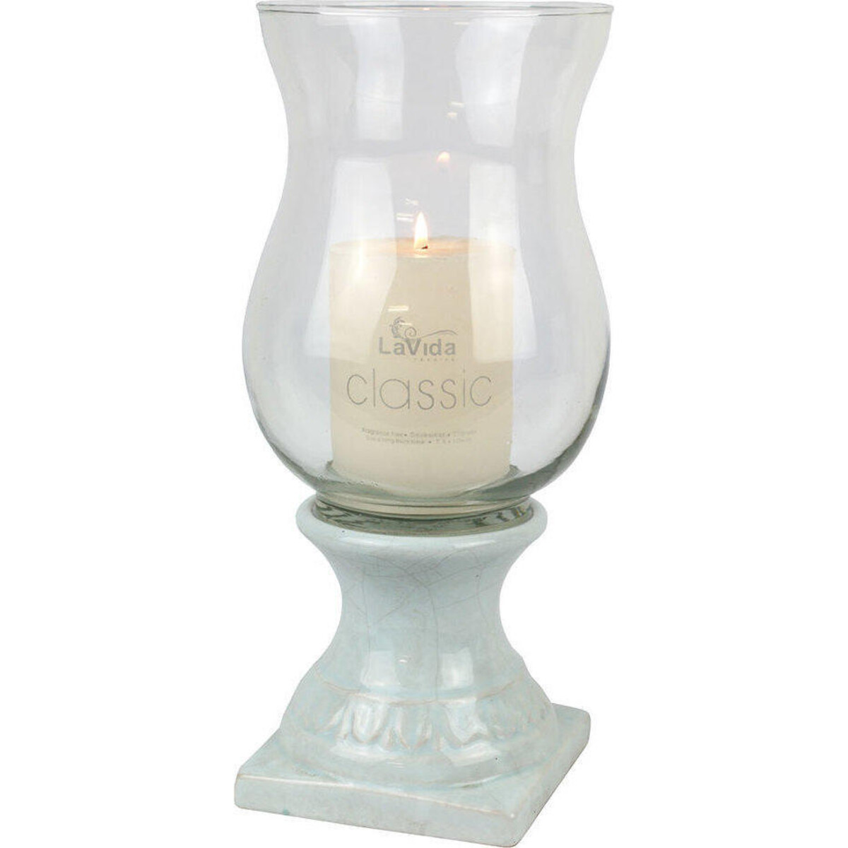 Opt for a departure from your usual kind of lighting with this gorgeous hurricane lamp that ends all the speculation about your leaning towards things vintage and old world - profoundly so, yet with a look of minimalism that is very country fresh and modern in its own way. Despite the lack of ornateness, the hurricane lamp does not lose out on detailing as its smooth crackled ceramic base has ample style going for it. The lighting with the help of a pillar candle too is subtle and stylish and will render the lighting to a soft romantic setting. Wonderful when your dinner moves outdoors and the guts of wind could take away the delight of a candle lit ambience. Use several such lamps in sets or in varying sizes for that utterly charming setting anywhere - be it the console, the sideboard, the dining table or your very own bedside table. The height of this piece is 32 cm and its base is solidly constructed and well balanced despite its height and its rather small base.