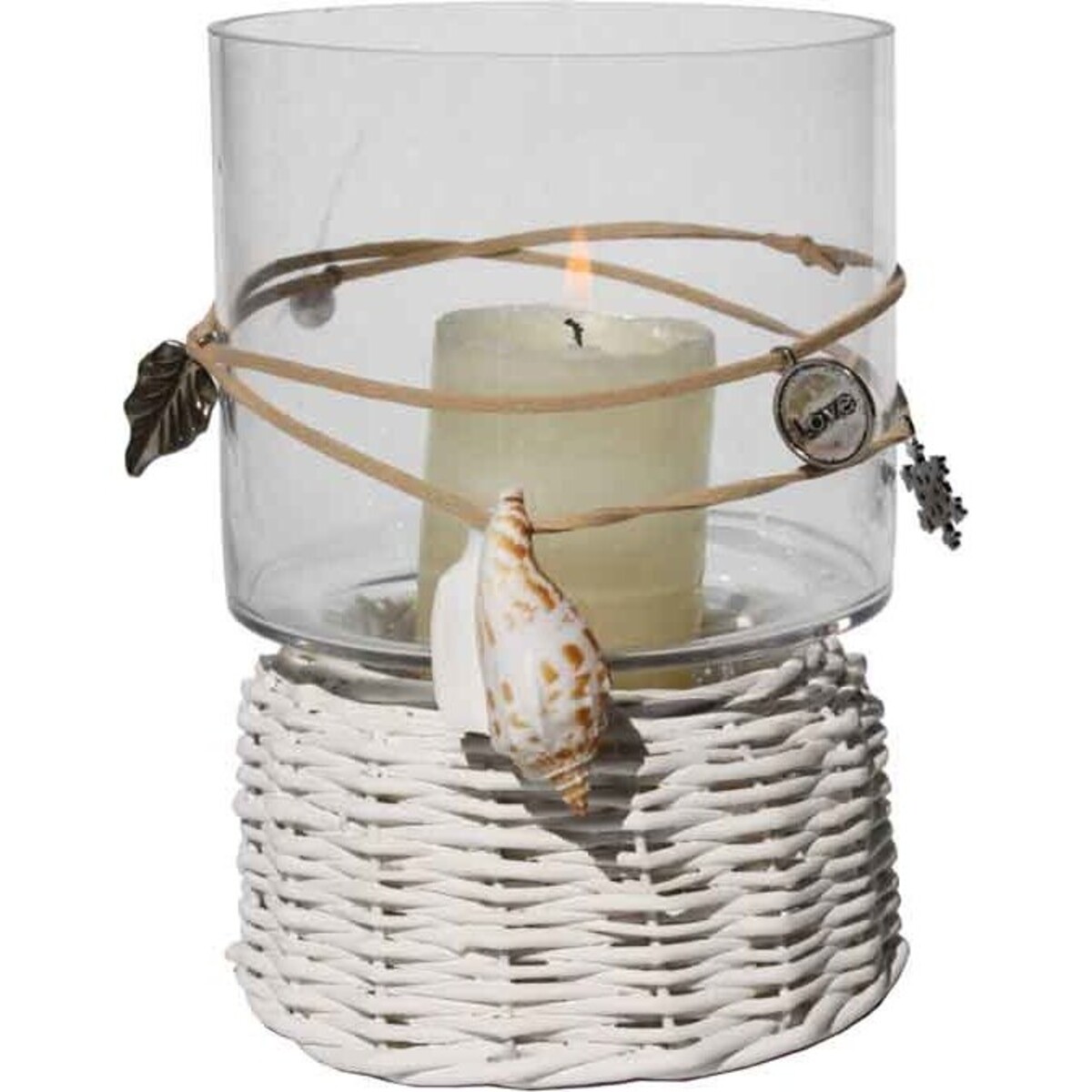 The exquisite and eye catching candle holder is decoratively patterned and designed for contemporary and modish homes, offices and any other venues. It is a perfectly neutral yet classy accent especially crafted with the beachside and nature inspired concepts. It also makes a remarkable gift item or giveaway during special events. Hurricane Willow Shell combines eccentric design with crafty and unique features. The candle holder showcases weaved handle or base. The bottom of the ornate piece is painted with white hue for a clean and neutral finish. The upper part is made from high quality, clear and transparent glass. The circular glass is embellished with brown knot wrapped around the body. It contains several items including the brown and white sea shell, circle bling with the word LOVE printed on it and other unique accents.