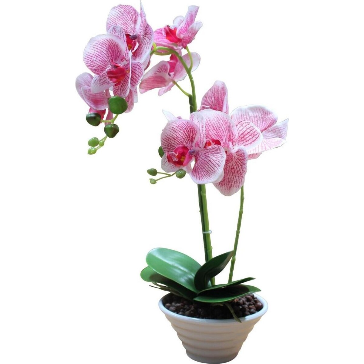 The orchid sits in its ceramic base, pert, pretty and aware of its enchanting beauty. Bring to your home the beauty of this rare and exotic plant that has been created from superior quality foam and plastic, replicating as it does in colour and form, with such absolute perfection, each and every feature of the plant. Here is a simple enough way to dress up corners, create special arrangement for special occasions and to liven up dull corners or window sills. Give the space colour and a warm summery association that all things tropical bring with them. The plant has two solid stems that rise to a height of 46 cm, the tiny ceramic vase holds on to the foam pressed base and keeps its balance well. The plant could be easily placed into larger vase as well for you to make a different kind of a presentation as per your need. A simple wipe of damp cloth will help keep the colour bright and beautiful.