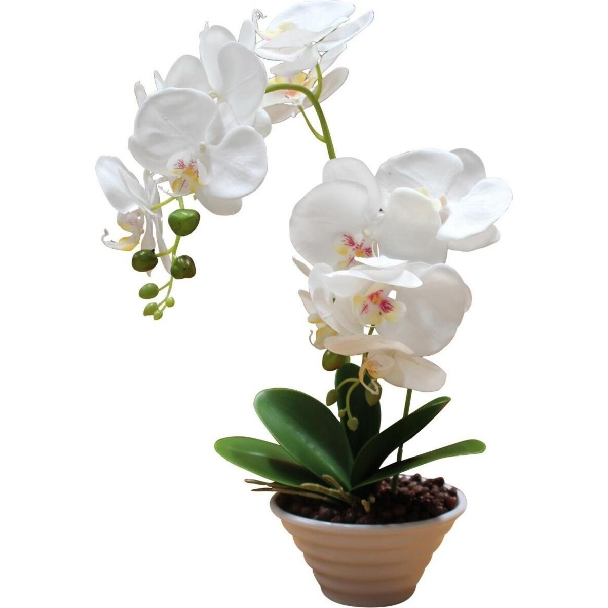 What could say it better than flowers. Something poetically beautiful about them-perhaps in their unspoken form of expression or perhaps in their ability to eke out the best in emotions-after all, the joy of seeing abloom emerge from the bud can only be felt and not expressed, which also says a great deal about the plant here. Made up of several blooms, some drooping and some standing upright as if trying to draw more attention to their riveting presence. This gorgeous faux plant copies the sublime with the dramatic -crossing the boundaries and yet restrained, add this not just to corners or to entryway console or the windowsill, but to any space that need livening up and a touch of soft colourful blooms will do wonders to bring it just that. The height of the plant is all of 46 cm and it opens its leaves to gain a width of 16 cm. the tiny ceramic pot it sits well balanced in is a mere 8 cm in height and to make its presence more prominent you could place the entire piece inside a larger ceramic planter.