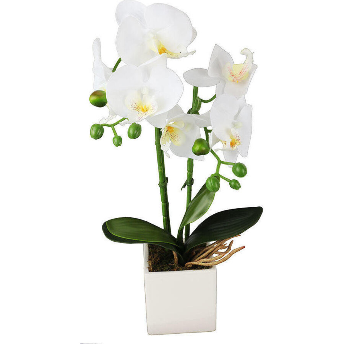 If you love the look of vibrant and rich coloured orchids here is one that will make you fall in love with things sublime and pale - an orchid made to perfection, planted in a ceramic planter that seems to be as natural as the rest of the plant. The blooms have perfectly formed veined petals, buds hanging by the side, rubbery leaves and aerial roots searching for moisture in the air. You would be stunned by the almost real - feel touch of the flowers and the leaves. Made of plastic and foam, there is hardly any part of this artificial orchid that falls short of the real thing in its detailing. The creamy white colour is subdued enough to be called real - the thickness of the leaves sand the stem in a brown that is very much like the real stems that sprout from moss and wood. The shedding free option will never wilt and makes your life simpler as its maintenance is as easy - a simple wipe of damp cloth and the plant goes back to looking fresh and dewy. About 40 cm in height - it would look fabulous in any space that needs a touch of beauty and natural style. Arch the stems as you desire as they are bendable and can be turned and arranged as one would like them to be.