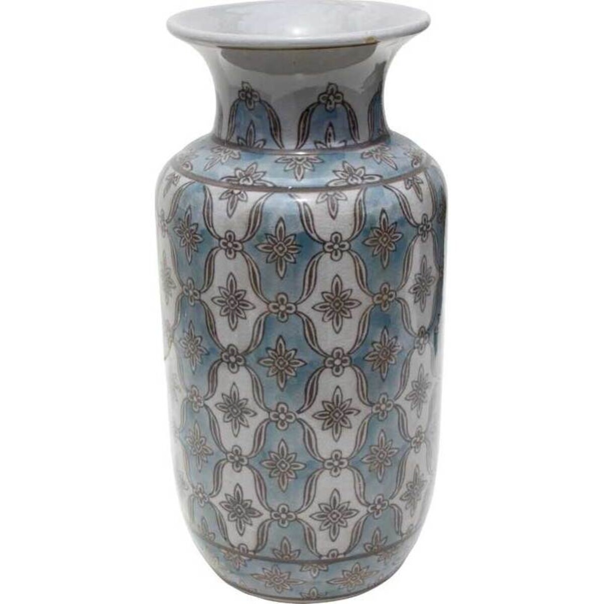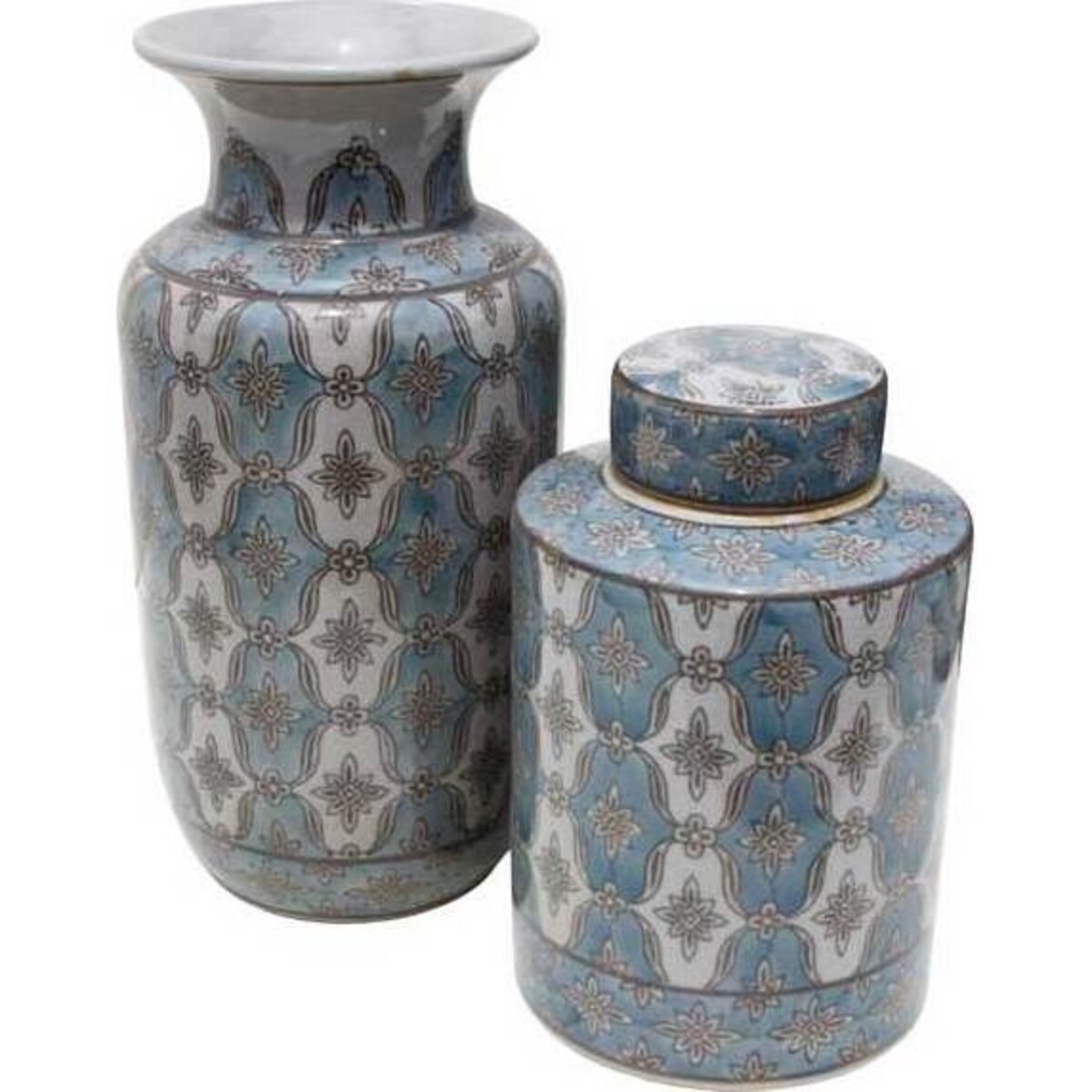 An alternating medallion pattern in pale blue and soft grey adorn the cool, white ceramic of LaVida's Jar Emblem Large. This traditionally styled jar is the larger of two in a collection, but can also stand alone as a classic accent piece.