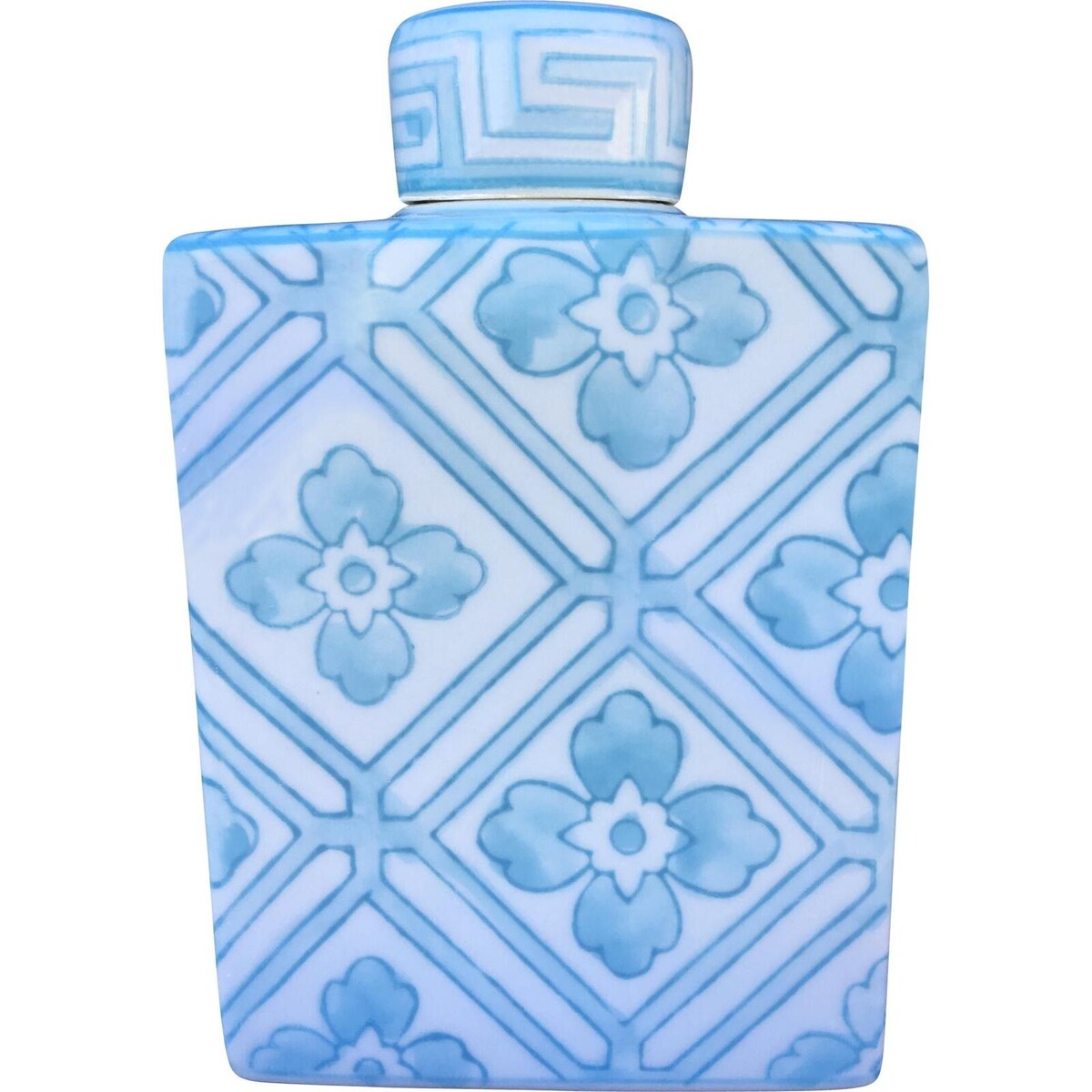 Homes reflect the people we are - and the choices we make in what belongs s to our home certainly helps depict the art and design leaning we have - here is a splendid means to make your artistic side come to the fore. The simple and beautiful lines of this high glaze ceramic container as such will be difficult to resist. The jar is 17 cm tall with a light blue floral colour that harks back to the times when blue and white tiling was the norm in several mid - eastern designs and architecture as well. The jar is topped with a cap and stands robustly on its rectangular base. The well - balanced design comes from perfect aligning of length and height. Could be used to break the monotony of spaces and helping blend in this lovely Mediterranean blue colour into it. Could be paired up with several such ceramic pieces and help create a more vintage appeal in that space.