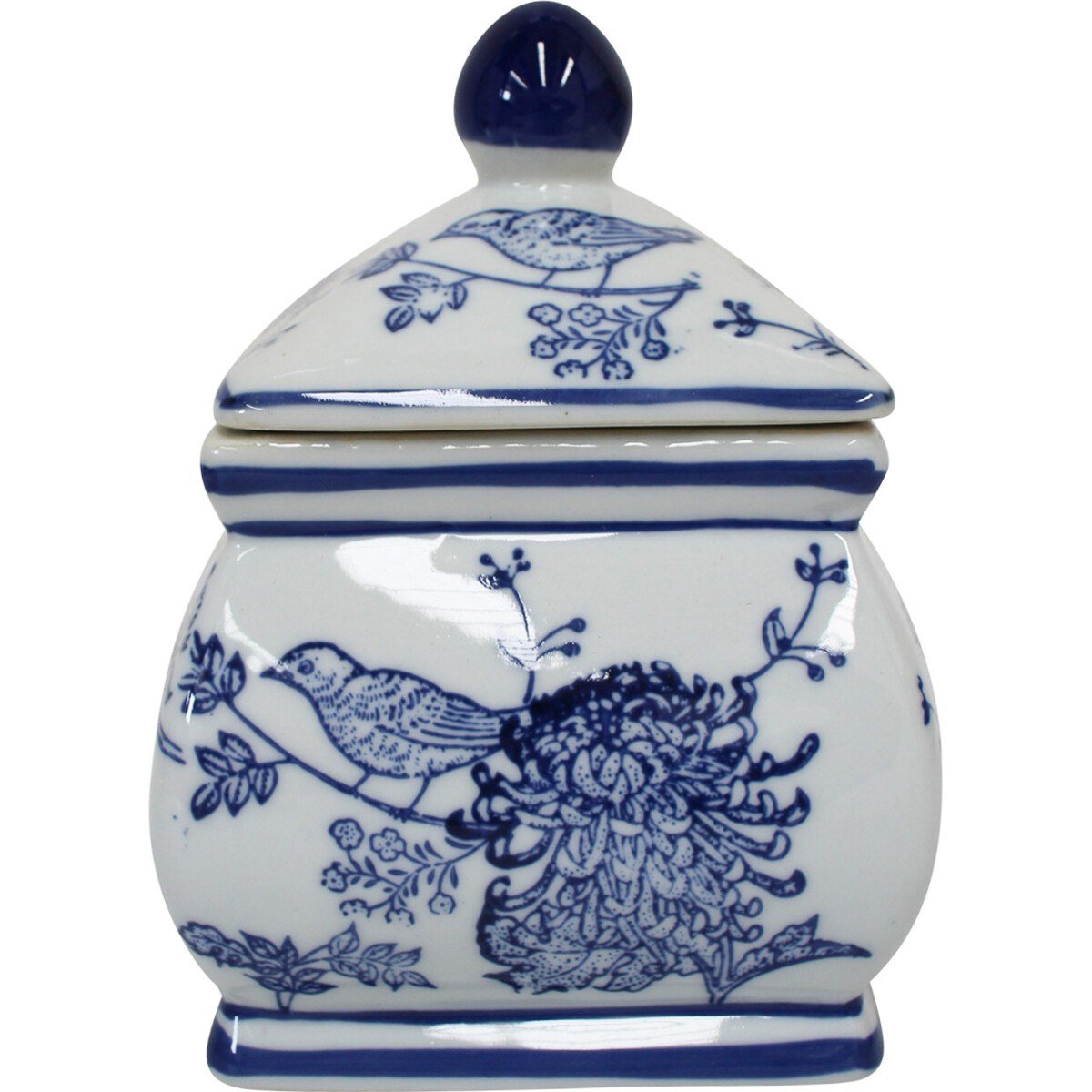 The Jar Pomegranate is the ideal visual foundation for every aesthetic decoration around the home and other environment. This is because it possesses exceptional visual appeal which is made possible through the fusion of two garden themes - pomegranate fruit and pretty birds. This jar has a distinctive shape which marks it out from amidst other decorative jars. It has a tastefully crafted lid which looks absolutely stunning! The domed part of this lid is painted luxuriously in the navy blue shade of colour while the pomegranate and beautiful birds are painted in the combination of both deep and pastel blue.
