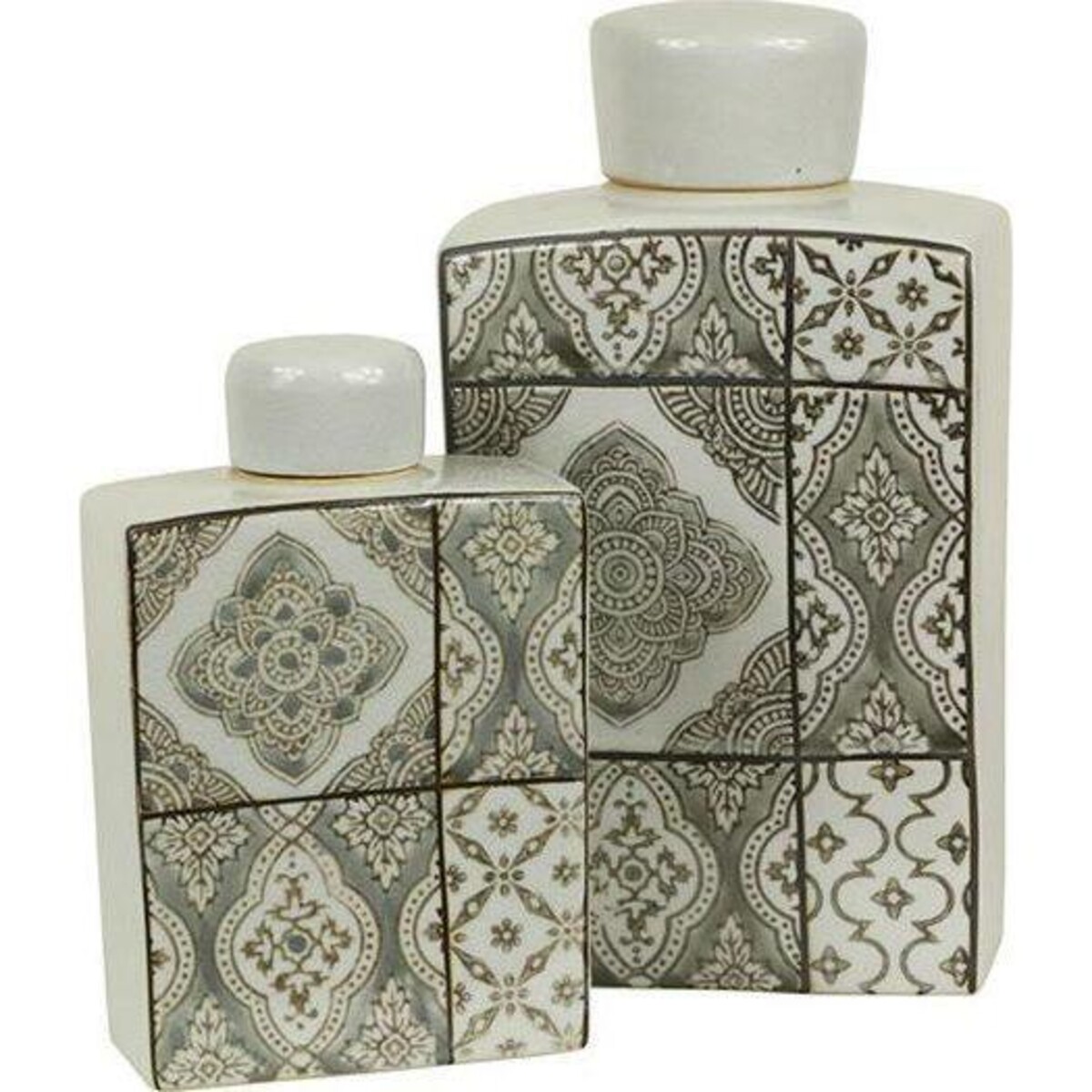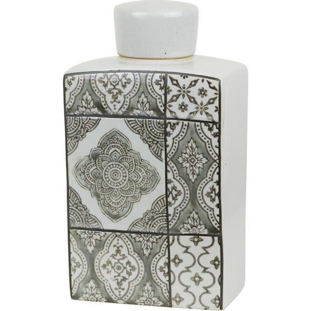 Ceramics are a wonderful choice in traditional ware and because they come in stunning shapes, sizes , colours and various cultural influences that it is indeed one of the greatest inheritances we own from the past and this jar with its Annas designed in white and grey is another stellar example of great ceramic work. Smooth bodied, tall, reaching up to a height if 25 cm, it reflects the beauty of the pattern so well. The bottle like jar has a small mouth that can be closed firmly and thus makes it a great candidate for storing fluids. The jar cokes with such a pleasing pattern that reminds one of ancient ceramic tiles that one cannot but appreciate the entire combination of shape, dimensions and design. A true vintage look addition to your home that can act like a décor filler and could be teamed up with the smaller version of the same jar. Use it on mantles, sideboard, the coffee table or the corner table where you could create cluster of such artisanal value pieces and make such lovely accent in the space.