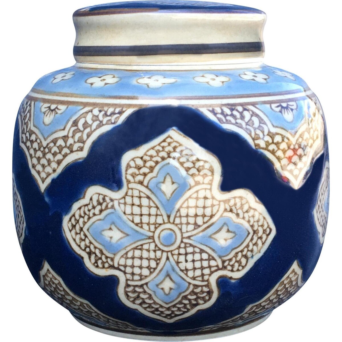 Storage jars could be in many styles, but this one is not mere storage but a storehouse of history and vintage style. Made by expert hands that know the artistry needed in creating high glaze on ceramics, it is imbued with the design and look of the past. The glorious mix of colour like white beige and blue come together in a unique classic pattern. The round body is moth and stands well balanced on its small round base. The height of the jar is 12 cm and its diameter is more at 13 cm which gives it its unique look - more like a small little piece of art work than a simple storage space. Enthral your spaces with this inclusion that builds in the artisanal flair as well as lends it a perspective built on art, colour, a certain shape and depth. Many such pieces could help create a very distinct kind of corner devoted to things crafted with care for a more intense burst f colour and design. A small little tile work design jar whose definitive role in making that space liven up with vintage magic is what its usp really is.