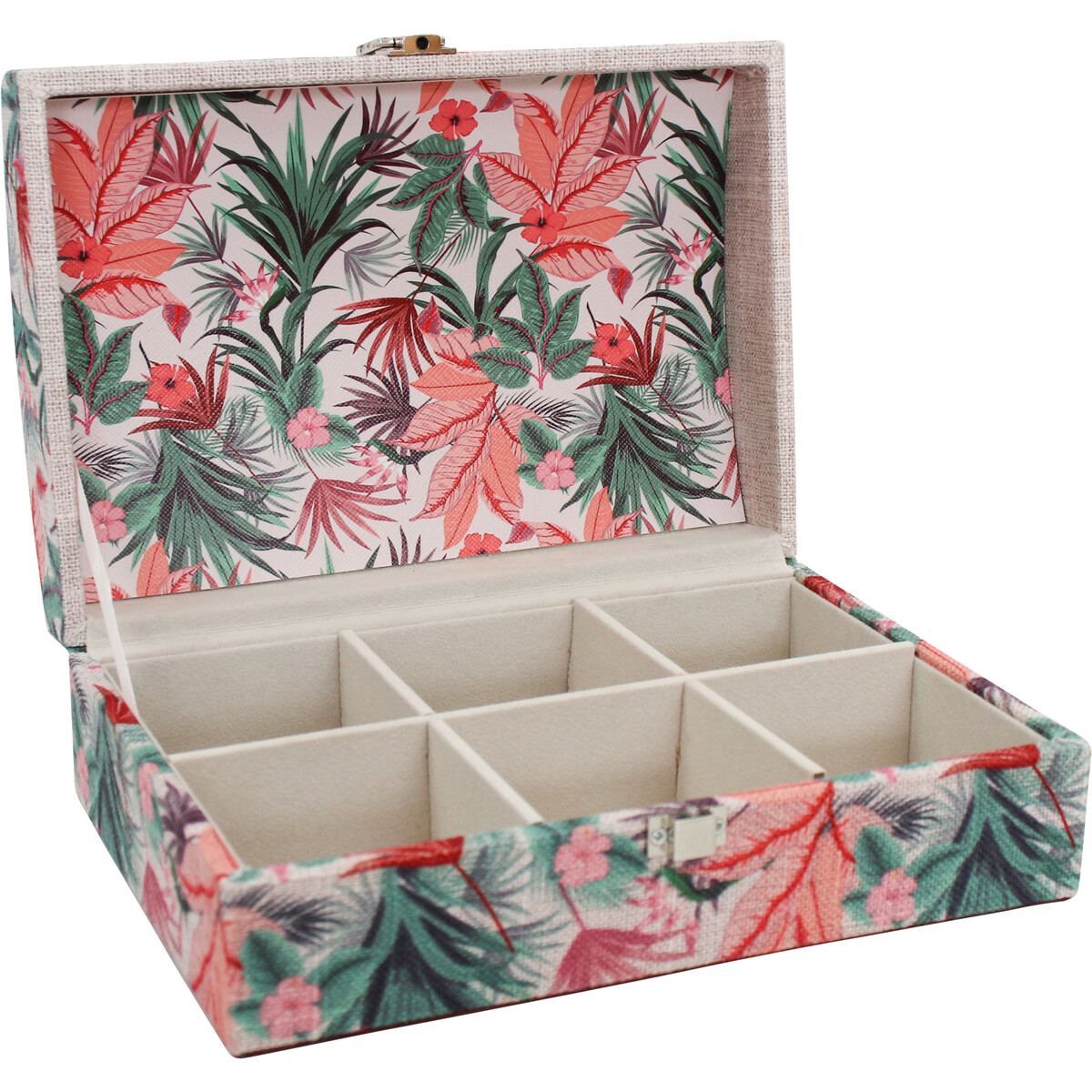 Made from MDF, this delightful organizer for your little treasures has been created keeping in mind your enormous appetite for collecting trinkets and your earnest need to keep the better organized. Made from MDF, it has a sturdy built and comes covered in linen, fabric known to be organic, resilient and wooed for its sustainable and organic appeal. If you have always been concerned d about entangled chains and missing earrings - here is an organizer that gives you six little compartments to keep your trinket well sorted and easy to access when time is scarce. Keeping things simple yet refreshingly delightful, this little organizer with its botanical print, comes covered in linen which also lines the inside of the lid. The clasp keeps things firmly in place and makes it great for your travel needs too. The vibrant colours of the desert leaves also add to its attractive apart from its great functionality.