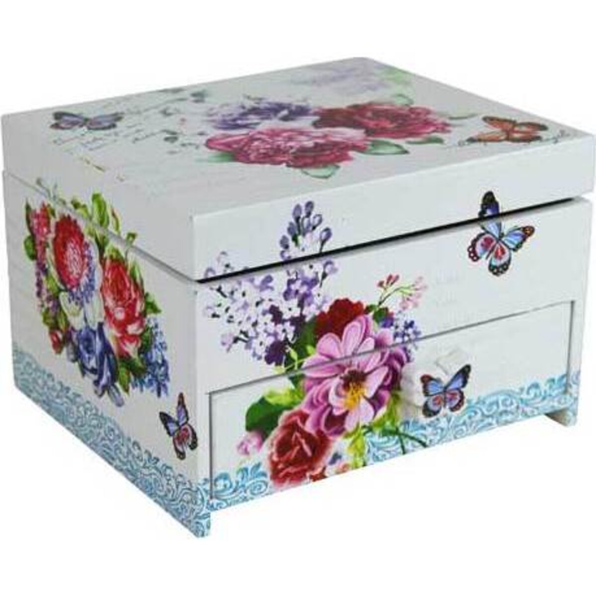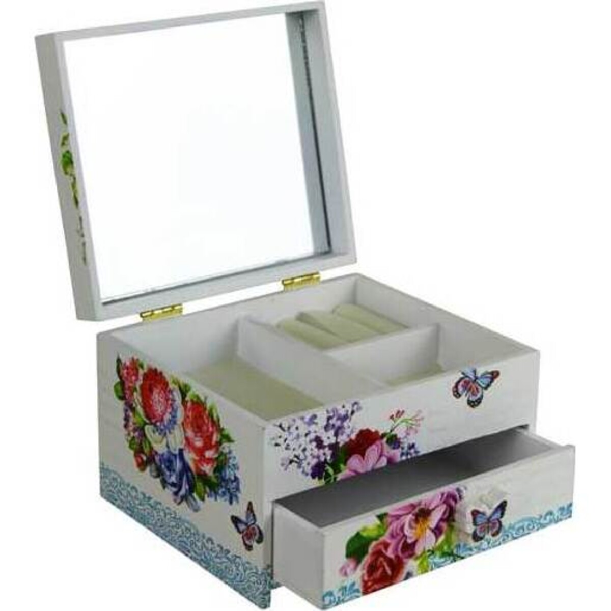 Both pretty and practical, the Jewellery Box Floral Butterfly from LaVida holds multiple pieces of jewelry in a two - section box. The top of the box features three compartments for jewelry organisation including one compartment for rings. The box also features a drawer underneath for additional storage. The hinged lid features a mirror underneath. The outside of the box is finished in a crisp white with an abundance of butterflies and spring blooms like roses and lilacs. A delicate blue medallion border runs along the bottom of the box and a butterfly - shaped handle adds a three - dimensional effect to the drawer.