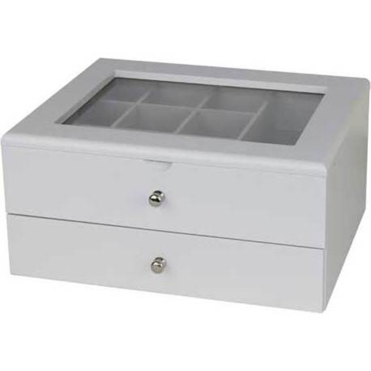 It has always been rather distressing knowing how badly you want to wear that antique ring and not quite knowing where you had carefully kept it. There being such a rush in everyday life that the job of getting ready for a special occasion allows one very little time to go hunting for what we have to wear. The effect usually is felt not so much on clothes as on trinkets. Here's simple enough solution - a box designed to ease all those upsetting moments - created with are to give each of your tiny treasures a specific place to be. The two tiered box has many tiny compartments in its 12 cm height, 25 cm length and 20 cm width body. The lid has a see through glass design so as to allow one to peep and check on the contents. The easy to pull out drawer feature too makes searching so much easier. The strongly structured body comes with a hinged lid, and smooth sea grey exterior that will make t look an accessory for your dresser or your table top.