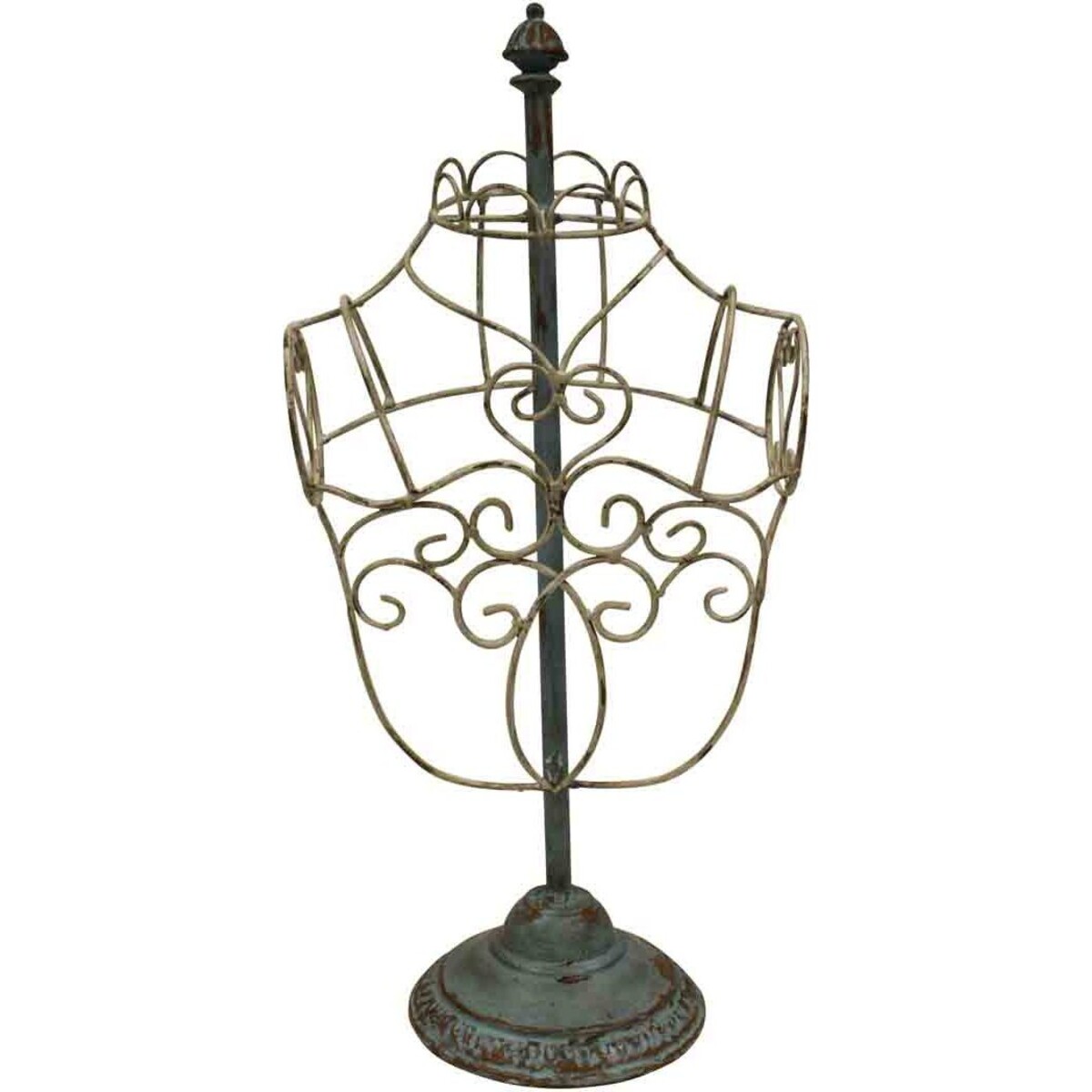The Jewellery Bust - Belle is basically an iron stand for various jewelry pieces - rings necklaces, bracelets, earrings. The only difference is that shaped like the usual bust. Because of the ingenious way it was made, it is one of the most interesting pieces ever made. The bust is shaped and formed as is but is made of twirled metal sticks. The top, collar part has simple concave bow. There is a heart-shaped form in the center followed by scrolled iron stems below it. A thick and long iron rod with a small button-like piece on one end is the main spine of the whole piece. The other end is attached to a wide, rounded base at the bottom. Even that has classical elements on it, carved with rococo floral embellishments. The iron bust is painted in a faded grey shade which gives it an antique look.