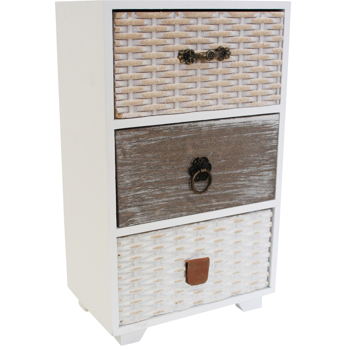 This is one of those pieces where the more time you spend looking at it, the more you notice - all those little details give it that warm, unique personality. It has a classic white frame but with three drawers that each have their own design - two in a woven look, and one with a kind of brushed wood grain finish, with three different types of handles. It is extremely versatile and its subtle, classic look will sit well in any space and with pretty much any interior style - contemporary, traditional or even rustic or country style rooms.