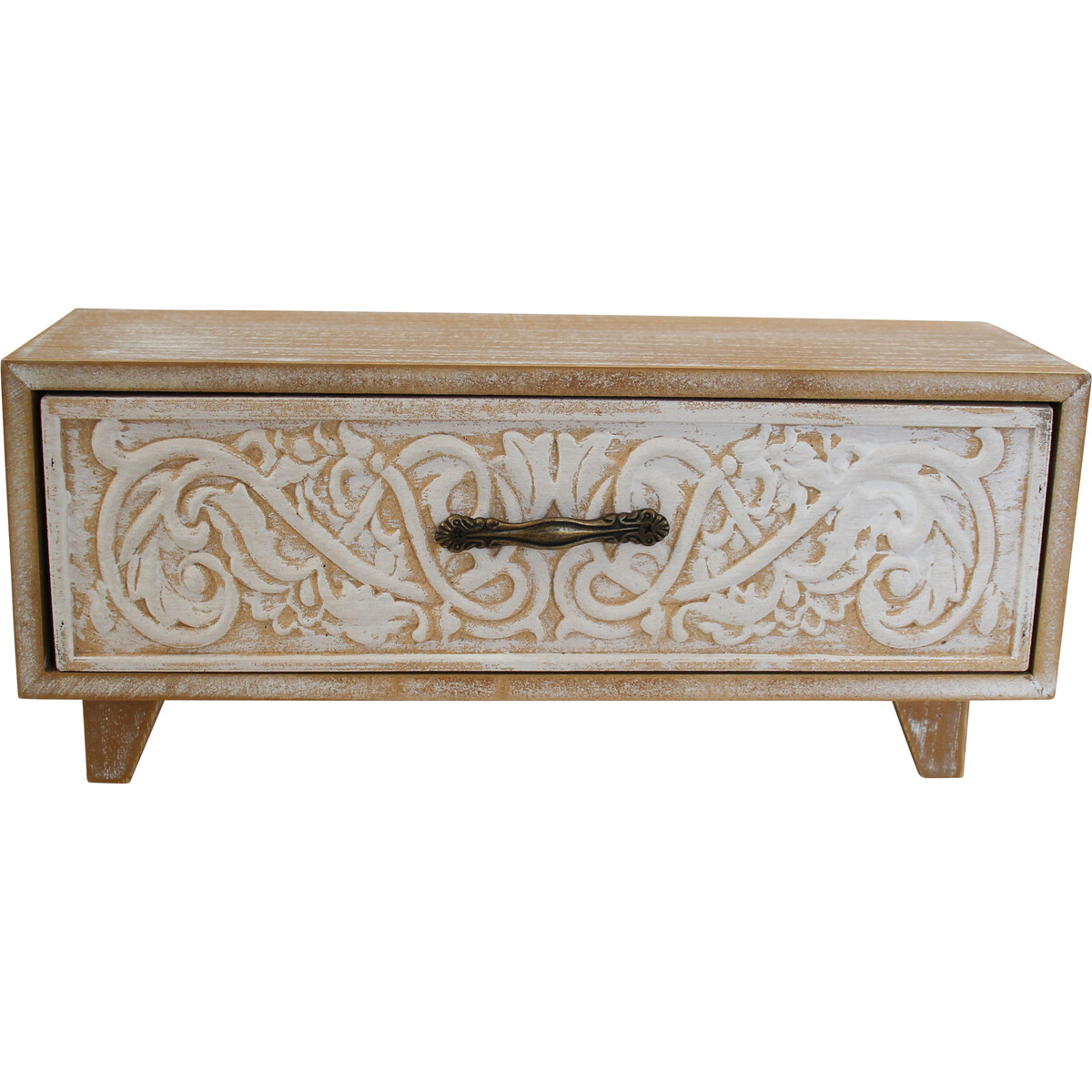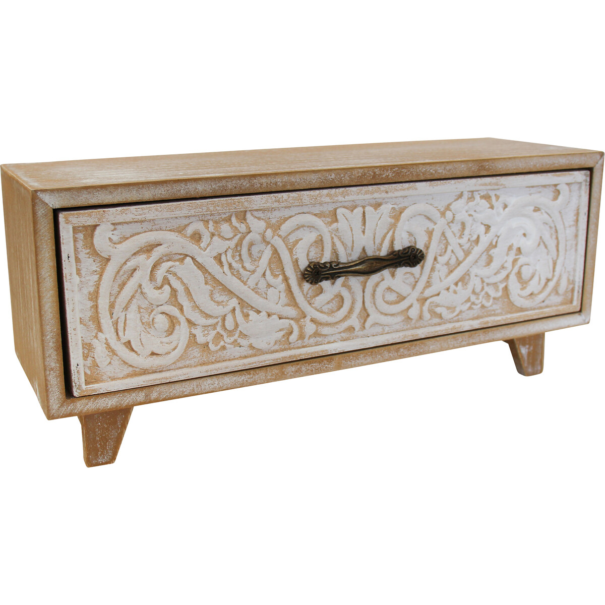 Several are the stylish features possesses by this Jewellery Drawers Florence 4 which makes it visually irresistible. One of such features is the portability of this drawer which despite its portable size, offers spacious storage opportunities for every user. Another of its attractive features is the ornately decorated lid which features artful designs of flowers and vines before being whitewashed. It is crafted in a rectangular shaped design which measures 30 centimetres in length, 12 centimetres wide and 10 centimetres high. It certainly would reflect the beauty of its content.