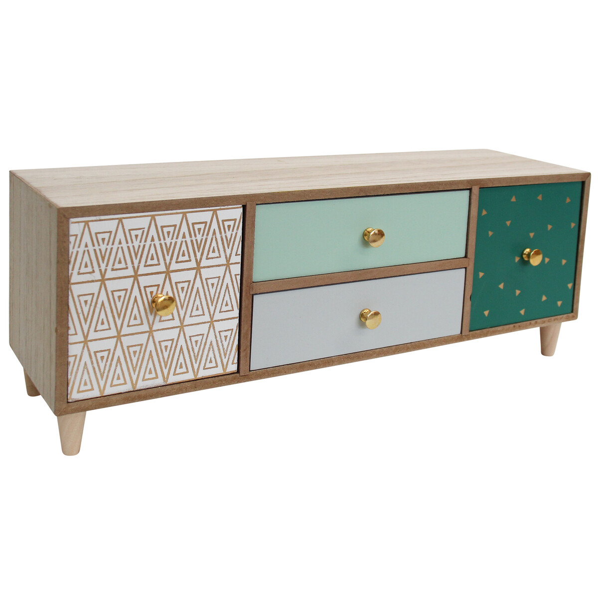 Two out of the four drawers in this Jewellery Drawers Indie 3 is made in a similarly sized square shape while the other two is made in a long rectangular form. Each of the two square shaped drawers is located on either side of this drawer set while the other two rectangular drawers occupy the middle with one placed above the other. The first of the square shaped drawers is decorated with pointy triangles facing up and down while the second square shaped drawer is painted in jade green hue and dotted with golden colour patterns. The middle rectangular drawers are painted in different plain colours.