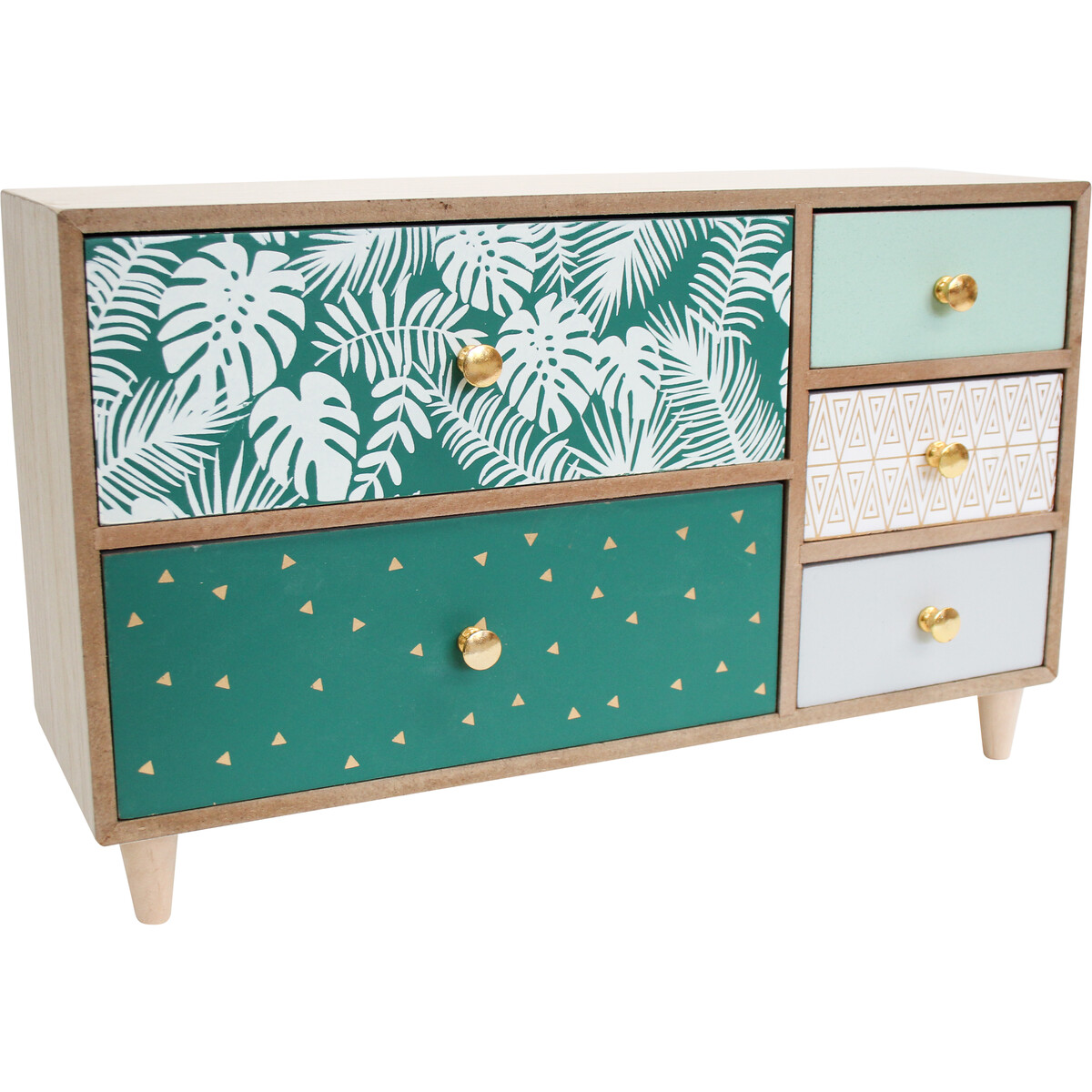 We’re still not sure what we love more about our Indie 4 Jewellery Drawers - the gorgeous tropical green and gold palette, or the perfect size for all your most-loved pieces. This 32.5 x 11 x 20cm organiser looks like a little sideboard, but it’s actually a clever, compact way to keep jewellery, cosmetics or any small essentials safe and sorted in five drawers. We’ve made it from sturdy MDF, and the gold hardware detail just makes those palm leaves pop.