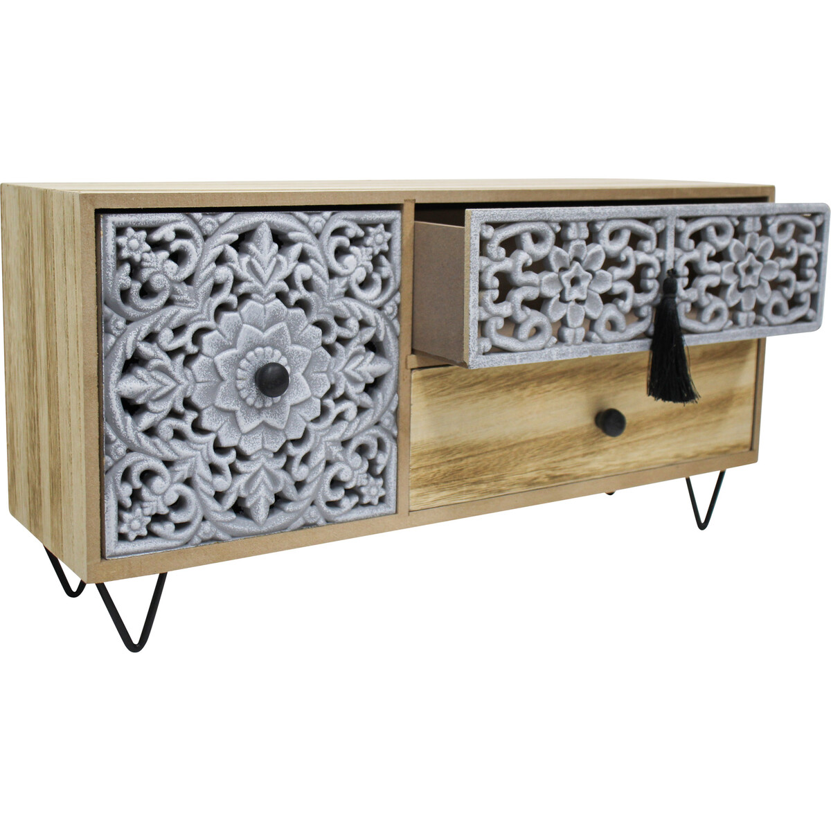 Our Jewellery Draws Mandala Long is one of those pieces that always gets a second look when we show it to retailers. We absolutely love the intricate mandala carving on this one - it's the first thing that catches the eye, honestly. Made from solid wood, the grey-tinted carved details are perfectly offset by the warm natural wood tones of the body and bottom drawer. And at 41x12x21cm, it’s a handy size that looks brilliant on a vanity but could really work anywhere - bedroom, home office, reception area or even in a small business as an organiser for odds and ends.