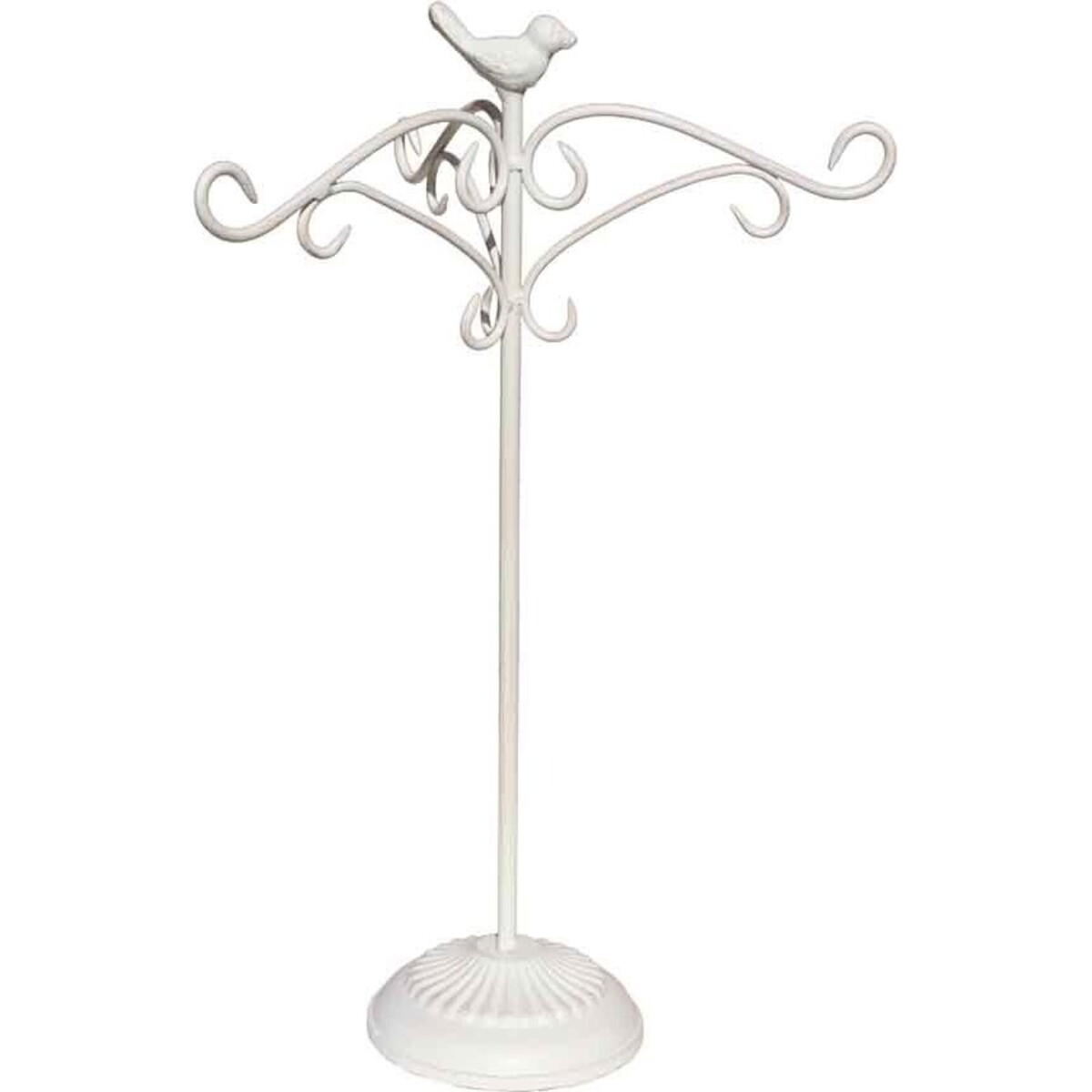 Design-wise, this item features a pole design with three branching hooks on top. The hooks come in elegant curves and create a fashionable statement. There is also a sculpted bird adorning the tip of this jewelry holder.