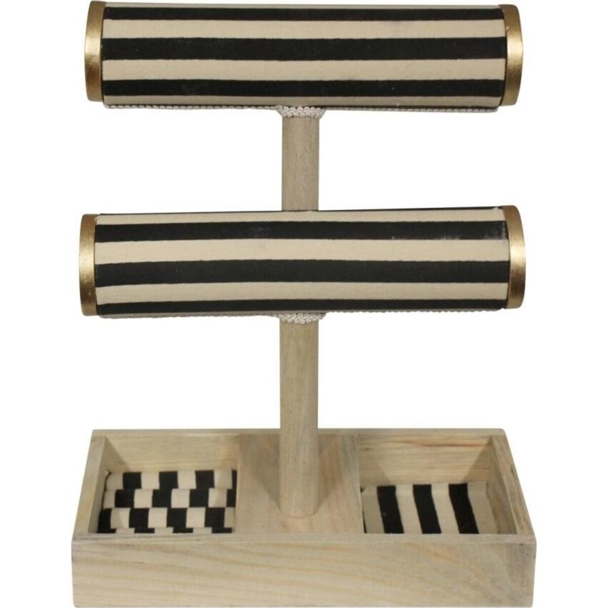 The stand is a mere 30 cm and its length across its width is just about 20 cm, and in that small little dimensional space it allows you four limbs on which you could place bracelets, bangles, cuffs and watches. The tray below adds to the multi - speciality of this organizer. The tray like base has sections - one for placing rings and another a trough like space that can be used for all other articles that you wish to simply place randomly. When placing chains and neck pieces could use the upper limbs that will thus allow you to hang even the longer pieces. Made majorly of MDF, the stand has a striped in black and white fabric covering the round links that section outwards and it is also seen on the base tray, thus adding to the charm of this piece. Can be placed on the dresser or your vanity. The well - balanced organizer will in fact makes dressing far less time consuming and you will now be able to each out for your accessories so much faster.