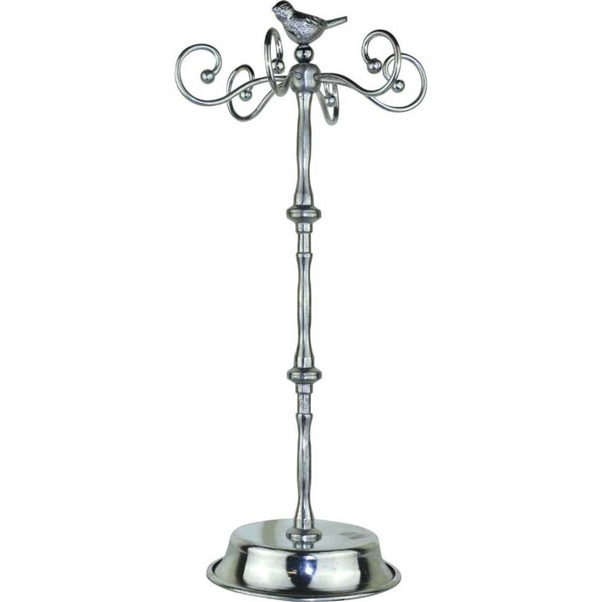 Created from metal, this stand with its delicate stem and a lovely bird top makes it not just unique but also quite special in its entire look. The stand has five curled extensions that work like arms perfect for hanging long chains, or draping them with scarves or for sticking a bunch of bangles or long hanging earrings, on them. There are so many ways in which this could be sued to prop up all your precious little belongings so that they are clearly visible, not entangled and also are adding to the neatness of that space. The stand itself is sturdy; metallic in colour with a tiny bird highlight on top makes the look of this hanger stand one of a kind and most suitable for the dressing room. Placed on top of the dresser to reach easily for last minute things you always need. About 23 cm high and with a broad and stable base ensures that it will not topple over or disbalance in case you happen to place far too many things. The smooth manner in which the metal has been moulded right from the top to the base is exquisite .