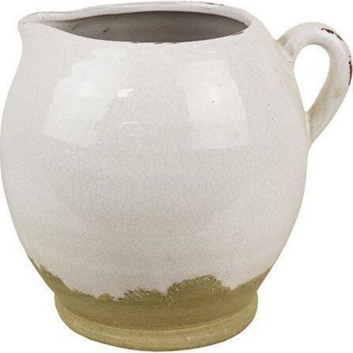 Making ceramic ware part of your table adds a huge amount of country feel as adds something very refreshingly organic to the look of the table. The jug features a smooth round body with a tiny little handle which is designed for a good grip while pouring. The mouth is wide and can be used for water as well as any kind of chilled drinks on summer afternoons. The gorgeous white and beige colouring makes it coordinate with almost all kinds of table ware. The jug has slight discolouration on the handle and the colour at the base is blotchy and uneven giving more character to its looks. Will look great with other stoneware and ceramic ware for the table. Add flowers to it when not in use. Its 22 cm tall body is at its widest about 23 cm and it narrowest at 20 which is at its base. Well balanced and easy to lift and pour. A contemporary look ceramic jug that will in infuse your space with class and a charm its own
