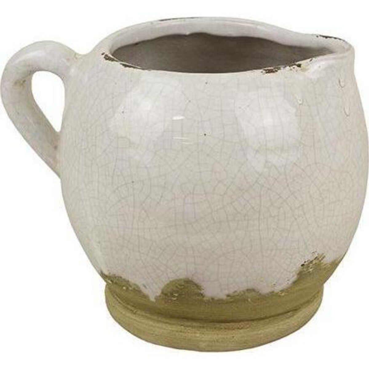 Add the distinct look of ceramic ware to your table with this tiny little addition whose feel is as individual as the hands that must have crafted it to such detail. The charm that ceramic can bring to your table is incomparable as they have certain imperfections that comes with handcrafted articles that wear their own distinct personality. This jug is all of 13 cm tall and can be used for pouring out any kind of liquids. The off white crackled body has missing colour missing along its brim, the handle is round and the snout is perfectly molded for easy pouring. The jug has a colour effect at its base and that makes the look all the more charmingly rustic. Add this to your collection of ceramic ware and see how well it will compliment the simplicity and style of your table. Has the ability to coordinate wonderfully with all other coloured dinner ware at the table. A small little jug like this can make all the difference to your coffee or tea time.