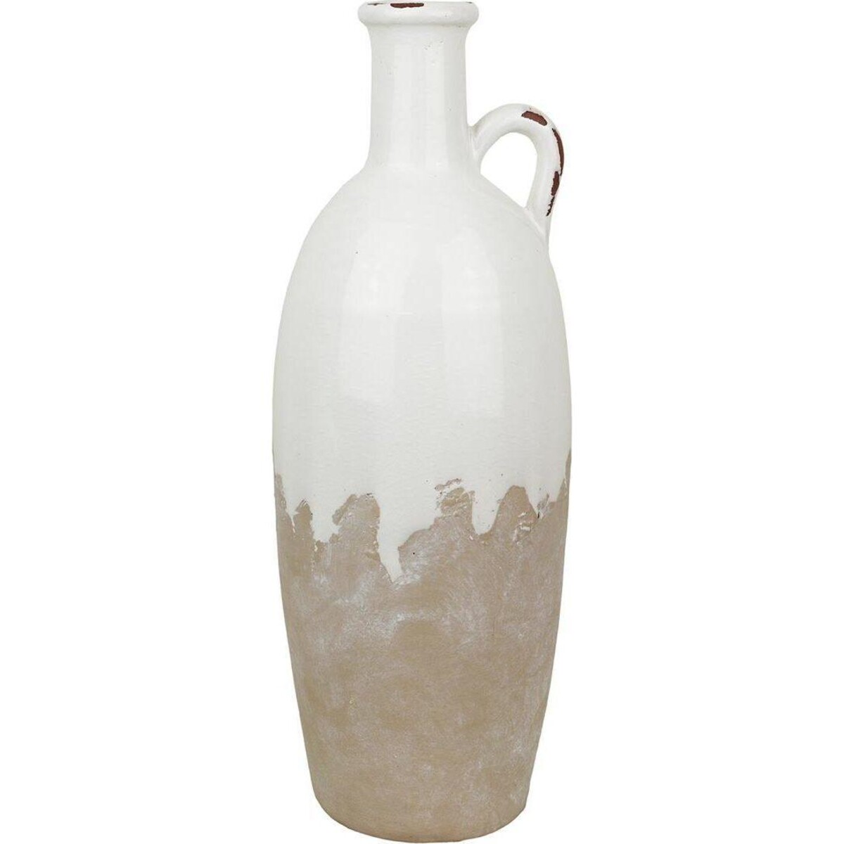 Ceramic ware has the ability to lend a rustic charm to our spaces as they are uniquely handmade and carry with them that stamp of personality that may come form certain irregularities in their features - maybe a callous on the surface, a dripping paint, the unevenness of certain shapes - and all of this makes each piece unique and worth coveting. There is nothing pretentious about ceramic art as it relies in the honesty of pure lines, artisanal work and the great ability to infuse a sophisticated glaze and colour on to the surface. It is this artistry that has survived centuries and continues to be one of the most prized of all of our artisanal history. Bring home this tall jug and make a spectacular splash of earthiness and class in your spaces. The tall white structure with its tapering smooth body, the gentle splash of colour in the lower portion ?all of t goes to make it a lovely addition to the décor. The jug is 40 cm tall, with a delicate little handle right near the end of its narrow upper body .