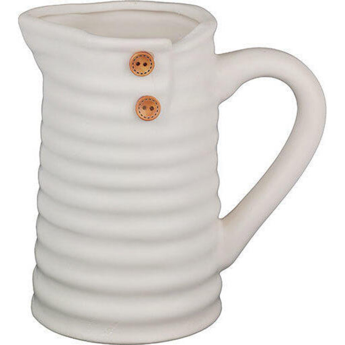 Ceramic placed anywhere in your décor will add a touch of farm and country freshness. Such is the look of this handcrafted beauty that the very look of clay glazed to such perfection renders the look to the space around. This vase cum jug could be used in a dual manner, working as great as a container for juices, chilled milk, or plain water. Place flowers in it when the functionality needs to flex to build in more charm into a space. Great for both jobs as the jug features a design detail that looks like a flap closed securely with the help of two ceramic made buttons. A modern twist in design adds to the ancient charm of a craft that has endured centuries. The height of the jug is 17 cm, the mouth is wide and the handle sized and curved in a manner that makes it perfect for holding and serving without the fear of spillage.