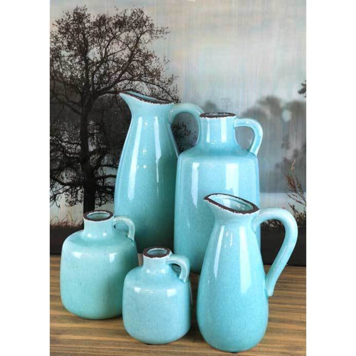 These beautiful blue jugs feature a crackle patter from the top to bottom of their facade as well as dark detailing at the opening. A handle at the top allows for carrying these jugs easily from one location to the next. While these jugs are ideal to use for their intended purpose as decorative accents, you can also use them in a multitude of other ways such as vases to brighten up your kitchen counter or to hold bright coloured pens on your desk. You'll love the style and colour they bring to any area of your home.