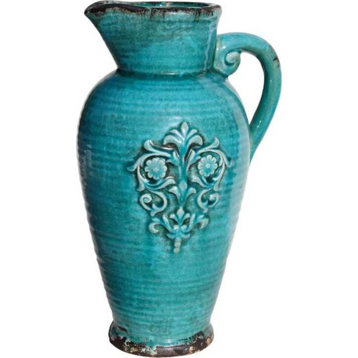 This Corazon Jug features a vibrant blue base with dark brown detailing on the bottom and top. At its center is a fabulous scroll and floral design that accents the piece perfectly. A handle at the side makes this jug easy to pour and carry. While it's ideal to use for its original purpose, it can also make a fabulous vase for a large bouquet of flowers, or can look just as beautiful when displayed as is. With so many ways to use this jug, how could you not want it for your own?
