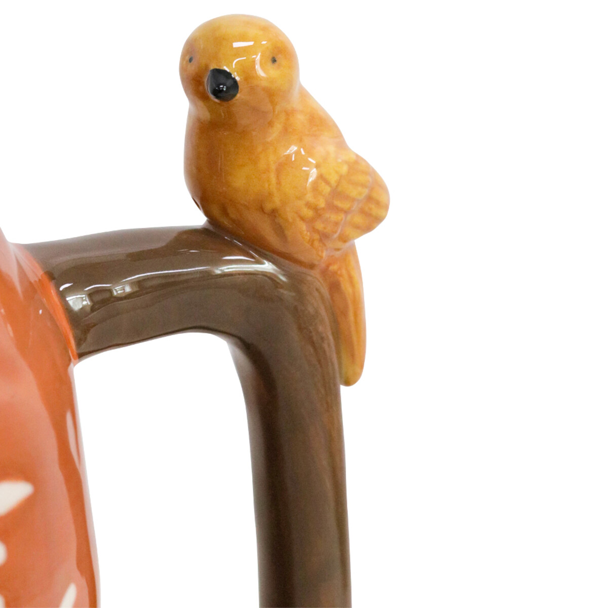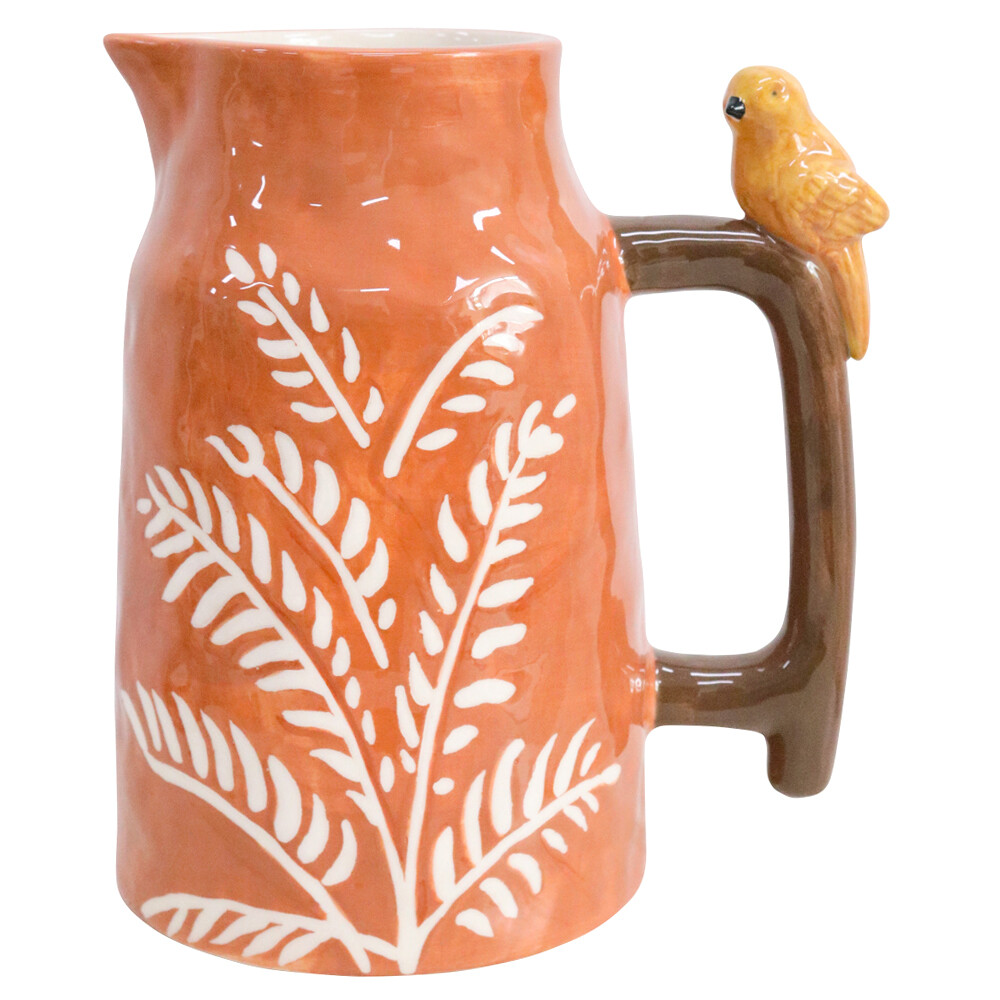 The Jug Fern Bird is a lovely, earthy little jug that brings instant warmth and character to any table setting. At 18.5x13x20.5cm, it's got a nice presence without being overpowering, and the natural terracotta-orange body with its hand-painted white fern leaf motif really stands out on shelves. The glossy brown handle, topped with a whimsical golden-yellow bird, adds just the right amount of playfulness - these make wonderful hostess gifts or practical centrepieces for anyone who loves farmhouse or nature-inspired entertaining.