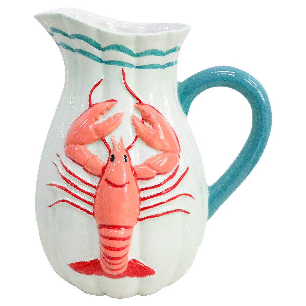 Jug Lobster - 16.5x20x23cm When it comes to fun jugs that manage to keep the whimsy going, our Jug Lobster has a fairly strong presence thanks to those deep red hues popping out front and centre. Tidy blue spout complements that golden orange shell, and you even get fine blue scales on the inside of the mouth to mirror what’s happening with that colourful handle. That luscious sheen is all down to some serious attention-to-detail behind the scenes; this glossy finish doesn’t just hold up beautifully in-person but also manages to reflect light nicely while still keeping things understated. Sized at 16.5x20x23cm so there’s clearly room for both function and display, we love how this fits into classic decor, nautical themes, or anything with a little more coastal charm. It’s hard dolomite so longevity is definitely there too, but keep in mind each jug is hand painted so you might spot some very minor imperfections here and there.