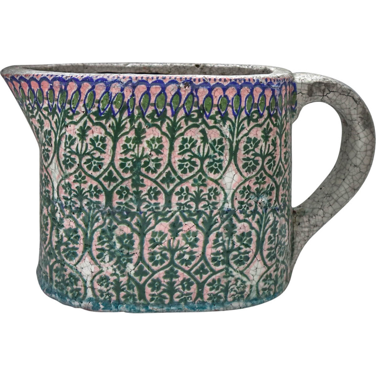 As Australia's largest online shop, our top priority lies in sourcing for practical homewares capable of giving modern homes and offices perfect decorative looks suitable for all aspect of your customers' living and work environment. One of such consistently products are those made of terracotta earthenware such as this gorgeous, portable sized Jug Oval Funky Green. It is moulded in a classically beautiful appealing design achieve through the use of terracotta earthen material and alluring floral motif. The ornate flowery motif is rendered in vivid green colours while close to the rim of the jug is a bright shade of blue and a smearing of pastel pink hue.