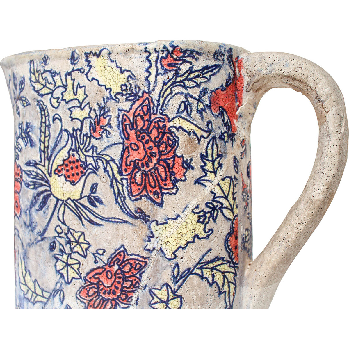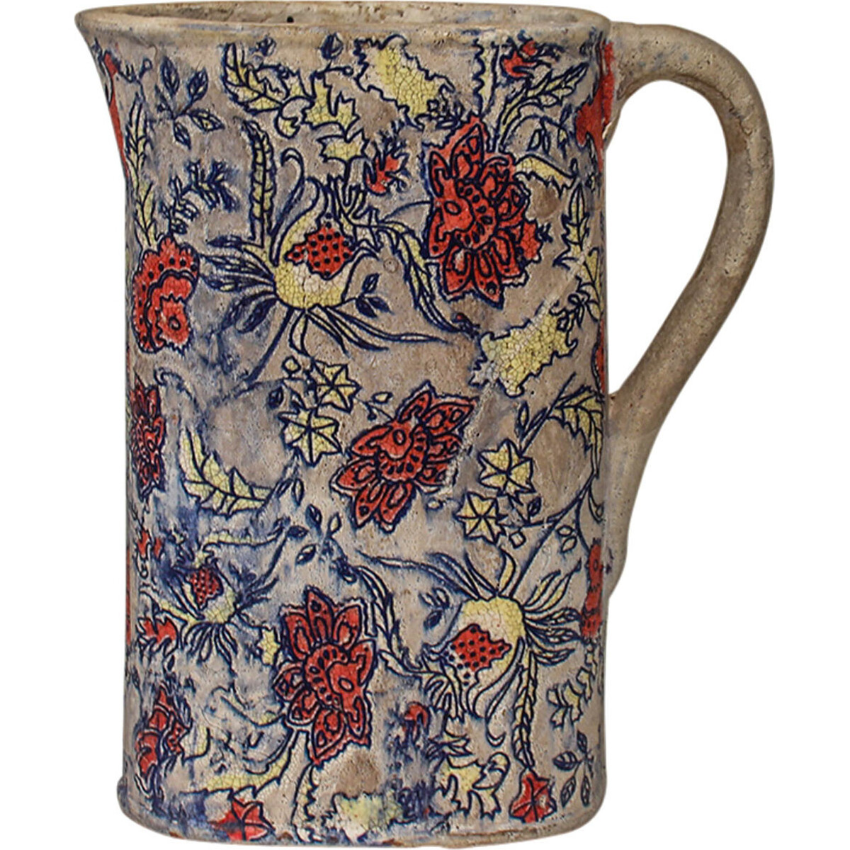 On the textured body of this extra-large ceramic jug is a strikingly colourful presentation of flowers in all of their colourful glory. There are flowers, plants and leaves of varying sizes, shapes and colours brightly painted on the jug. Notable colours used in achieving this floral motif include red, yellow, and light shade of blue. With a glazed rustic look, the jug changes the decorative ambience of interiors by importing the beauty of the garden right into the home. There are 4 of these floral themed jugs in every carton that you order today. So, go on and place your order now.