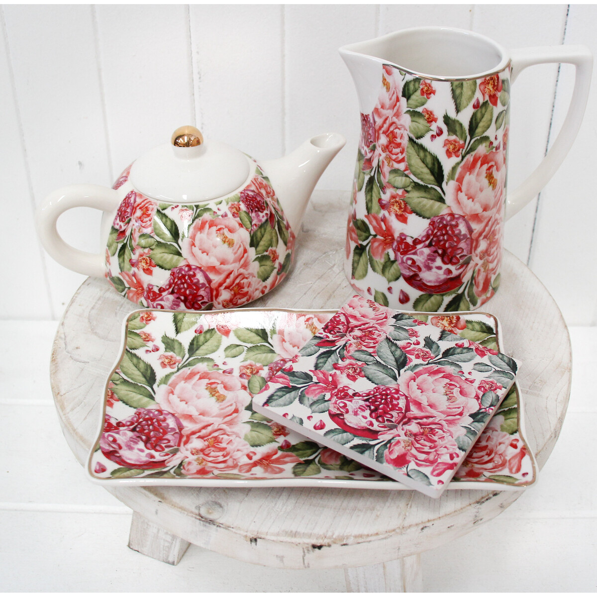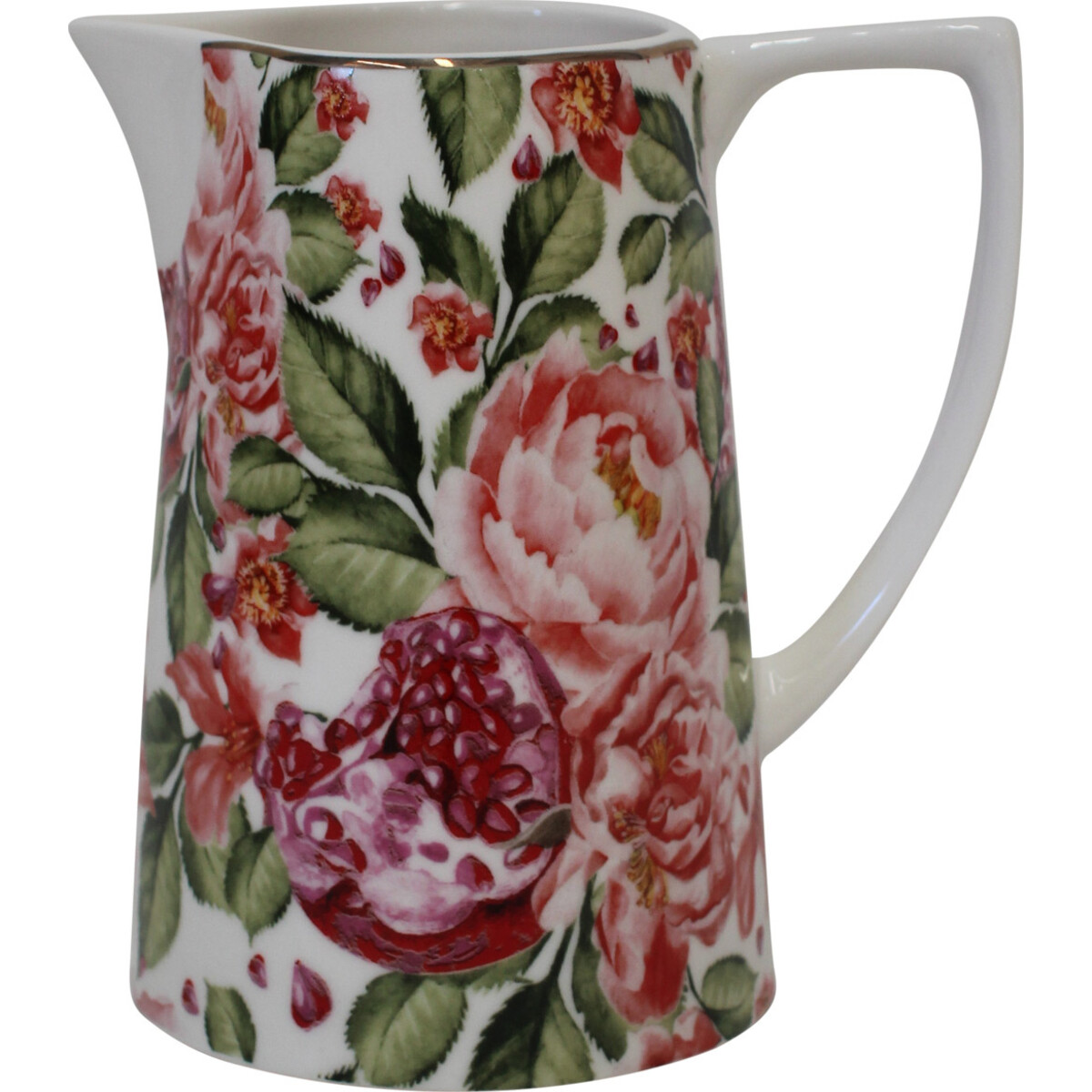 Did you know that the French name for the pomegranate fruit is "grenade"? There's no need for alarm, this product is just a jug. But then, it is no ordinary jug but one with exemplary crafting and ornate pomegranate fruit glazing. Moulded in a spotless white colour, the pomegranate glazing is rendered in bright shades of red, green, and pink. The jug also has a user-friendly design as it can be held through an ergonomic handle with a firm, comfortable grip and has a perfectly shaped lip for easy pouring.