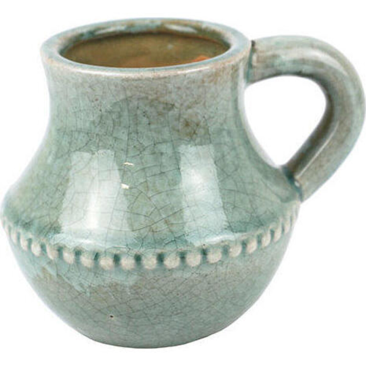 Make small little changes to the way you serve your cold and chilled fluids this summer with a gorgeous handcrafted ceramic jug that combines the best in glazed look design on a muted soft grey blue and see the amazing freshness it brings to your palette as well as your table setting. The jug has a shirt round base that narrows to a more conventional top with a curved handle gracefully adorning the side - fused neatly on to the top portion, allowing one a great grip to help pair effortlessly. The beautiful drama of a grey crackled surface seem all the more enchanting when paired with rustic cotton linen or burlap runners. Complete the look on your table by adding more such ceramic pieces that will lend it a look of farm freshness and yet when needed move on to a more antique vintage shabby chic look. The jug is most suited for clod liquids like lemonade, chilled milk for your cereals or plain water. The height of this piece is 13 cm while at its widest it is 16 cm and 12 cm at its narrowest.