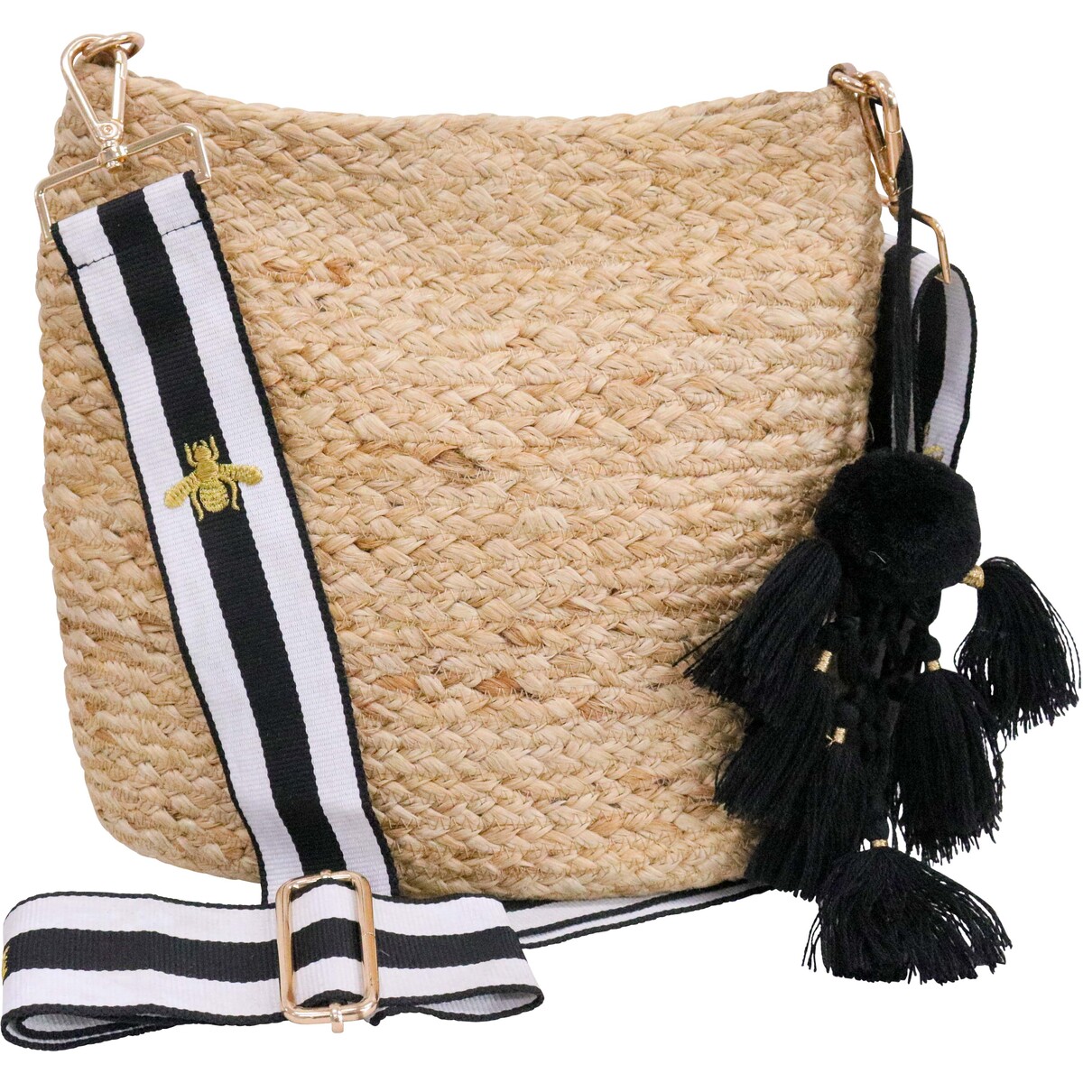 Elevate your accessory collection with the Jute Tote featuring a Bee Cross Body Strap. At 28x26cm, this chic and sustainable bag is crafted from resilient jute, making it both stylish and eco-friendly. The standout feature is its eye-catching black and white striped strap with a charming bee motif, perfect for attracting eco-conscious fashionistas and driving sales.