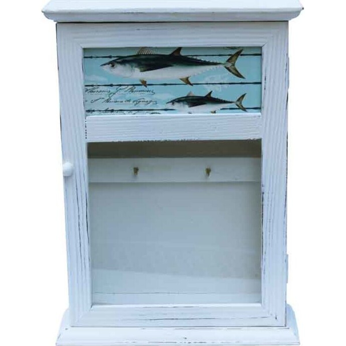 The fixture showcases a mini cabinet construction with easy to open door. It has glass materials to see the inside of the fixture. The upper portion is accentuated with the fish images in light blue colour base. Two key holders are inside the key box.