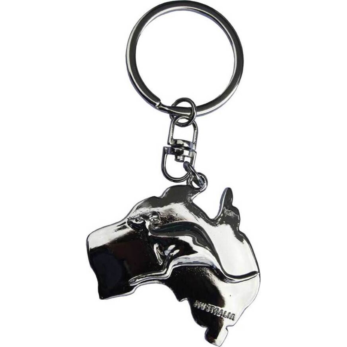 Whether you're customers are Australian or just love all things down under, our Australia Keyring is something they may want to add to their charms and collectibles. • The silver tone ring is of the safety type, with a double wrap overlay that will securely keep keys in place. • The continent is outlined in a heavy metal silver tone charm with a beautiful high polish. • The kangaroo, which can only be representative of this great country, bounces along his way on the front of the charm. • The word "Australia" is etched at the bottom right near what would be Melbourne or Victoria.