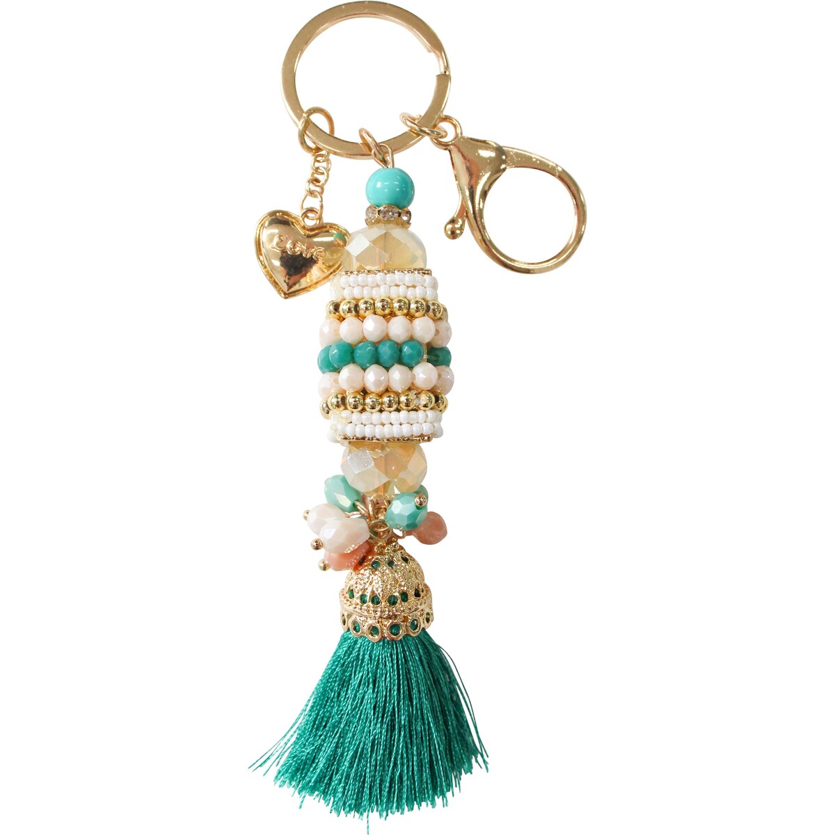 This Keyring/ Bag Hanger in Teal is such a satisfying piece to stock. Whenever we send these out, someone always comments on how striking the green is or they pick it up and instantly imagine it with a certain bag. It's got this layered look from the rounded beads - in teal, gold, white, and soft peach - which are arranged in bands and clustered at the top and centre. The way those gold beads give it a little bling is subtle but makes the whole thing pop. It's detailed without being fussy - not too much pattern, not too busy - so it suits all sorts of decor styles from coastal through to something more refined.