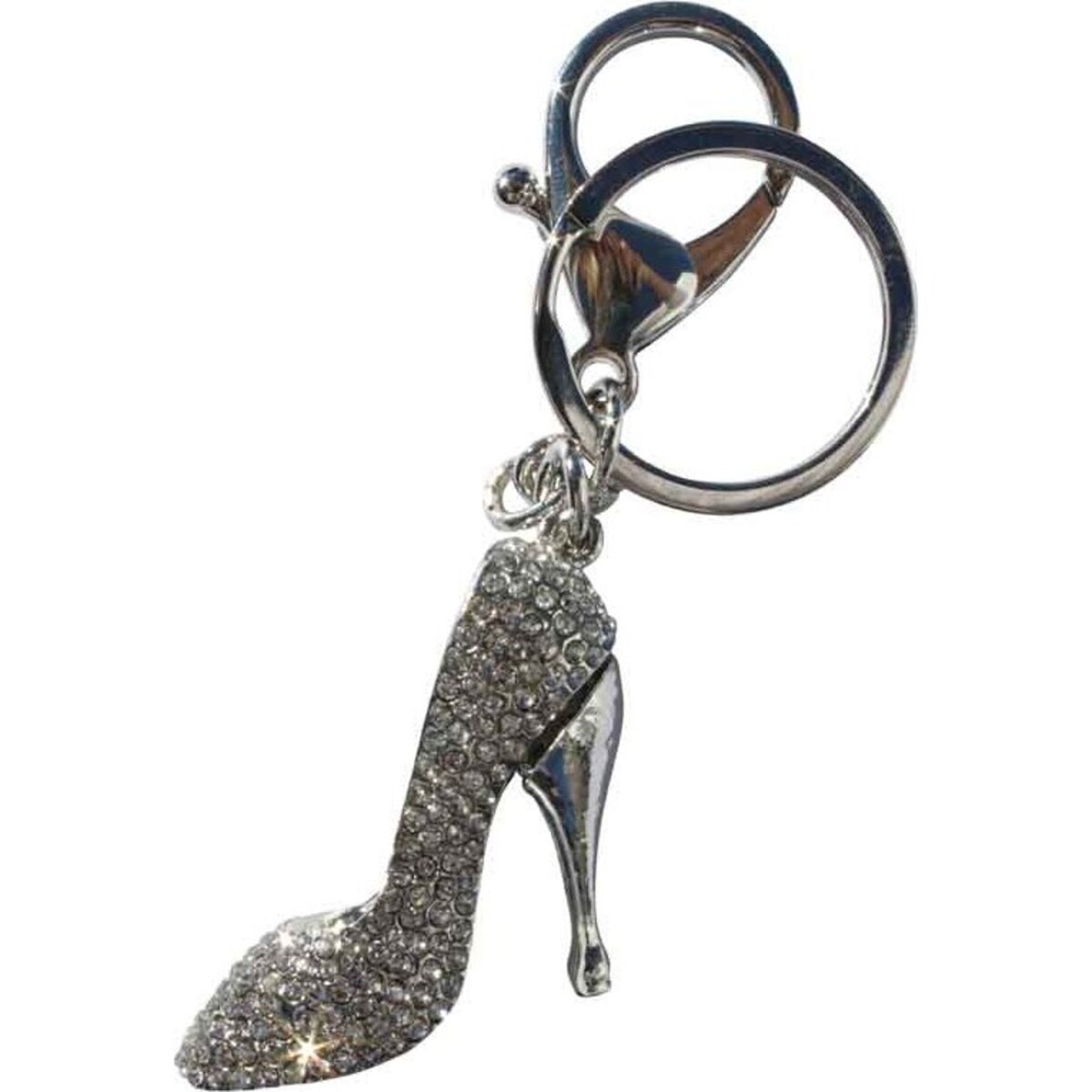 The high-heeled shoe is covered with white crystal like stones that makes it look like a realistic replica of a pair of designer shoes adorned with Swarovski crystals. The shoe's heel is of a shiny silver like metal, another shimmer that adds elegance and extravagance to this luxurious looking ornament Keyring - Diamonte Court.