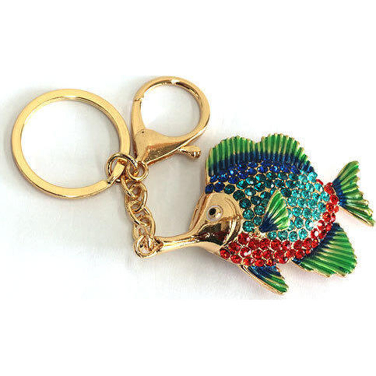 Give your keys a stunning looking accessory to latch on to. This beautifully created fish keyring features a metal made creature whose dramatic colours will make it such a head turner that anyone who loves tiny embellishments would love to won it. What is all the more interesting is that not only will it allow your keys to be in one place but also ensure that while working as a key ring, it will make your bag purse, or belt look as sunning as its very own design. The fins, the gorgeous tail and head, are so well defined that despite its very small size, it still manages to make such an impact with its presence. The metal body is tarnish proof, the colours truly vibrant and the differently coloured stones will remain as bright and well encrusted despite much usage. The slight enamelling combines perfectly with the golden body and the multi - coloured crystal usage. A definite find for all who love the drama that things blingy bring with it.