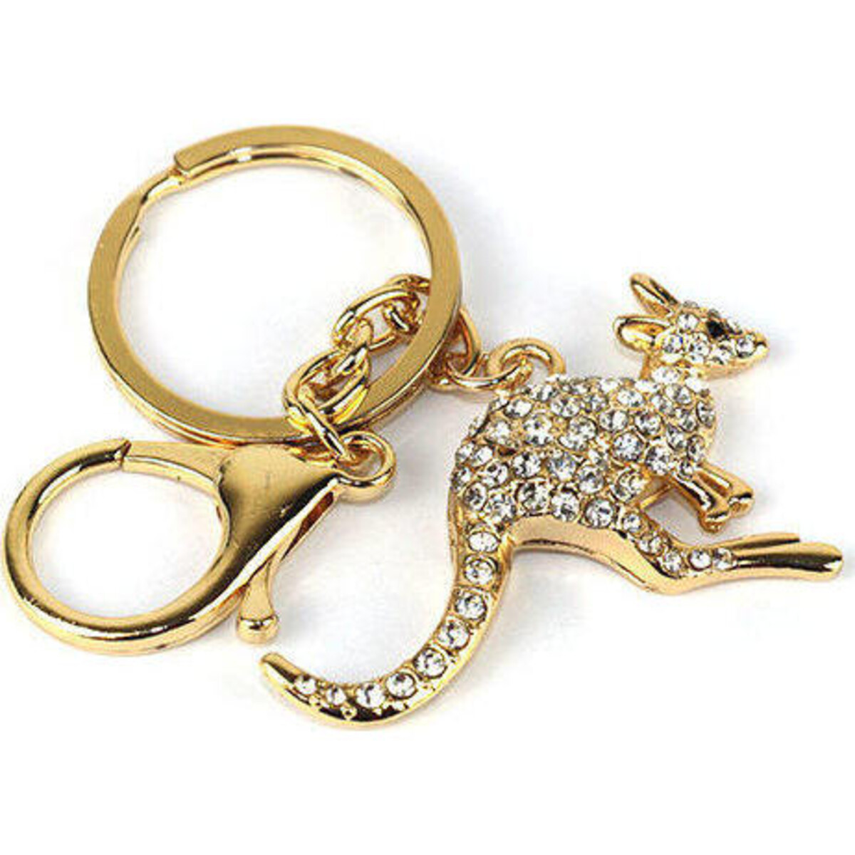 If you have been harried about the manner in which you waste your time searching amidst all your things for those tiny little keys holding your other plans up - here is some help in the simplest most conventional of ways - a simple key ring that helps you bunch them up as per your need. This one of course has the advantage of a lovely metal and diamante made kangaroo that adorns it and makes it all the more covetable. It is blingy with its gold coloured metal body and the absolutely brilliant usage of encrusted diamante, yet within that there is a certain class and glitz - a touch of fun and playfulness that makes this kangaroo so endearing that you would love to have him hangout with you - perhaps from the loop of your belt, or that of your gym bag and would not mind being seen in your hand as you twirl the keyring in your very hand. After all the very reason it makes a great accessory too is because it makes the person holding it look good !