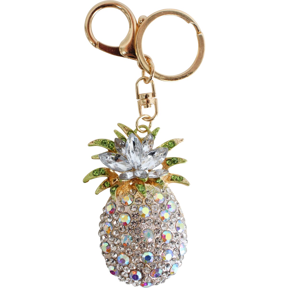 This bright and blingy ornament takes inspiration from a charming pineapple. Beautifully handcrafted, this piece makes a stunning accessory. Made of metal and adorned with gemstones to make a dazzling finish. This keyring is small enough to fit in one's purse and pocket.